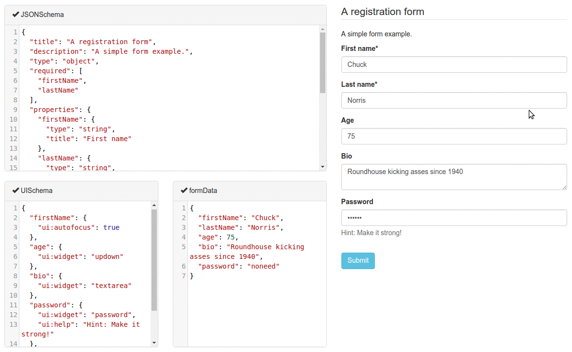 react-jsonschema-form:是一个由 Mozilla service 开源的通过 JSON 直接生成表单的 React 组件。GitHub 地址: