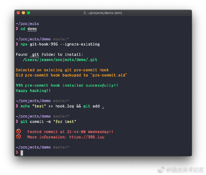 1⃣️git-hook-996:限制开发者不能在非 965 正常工作时间提交代码,效果图2,项目地址: