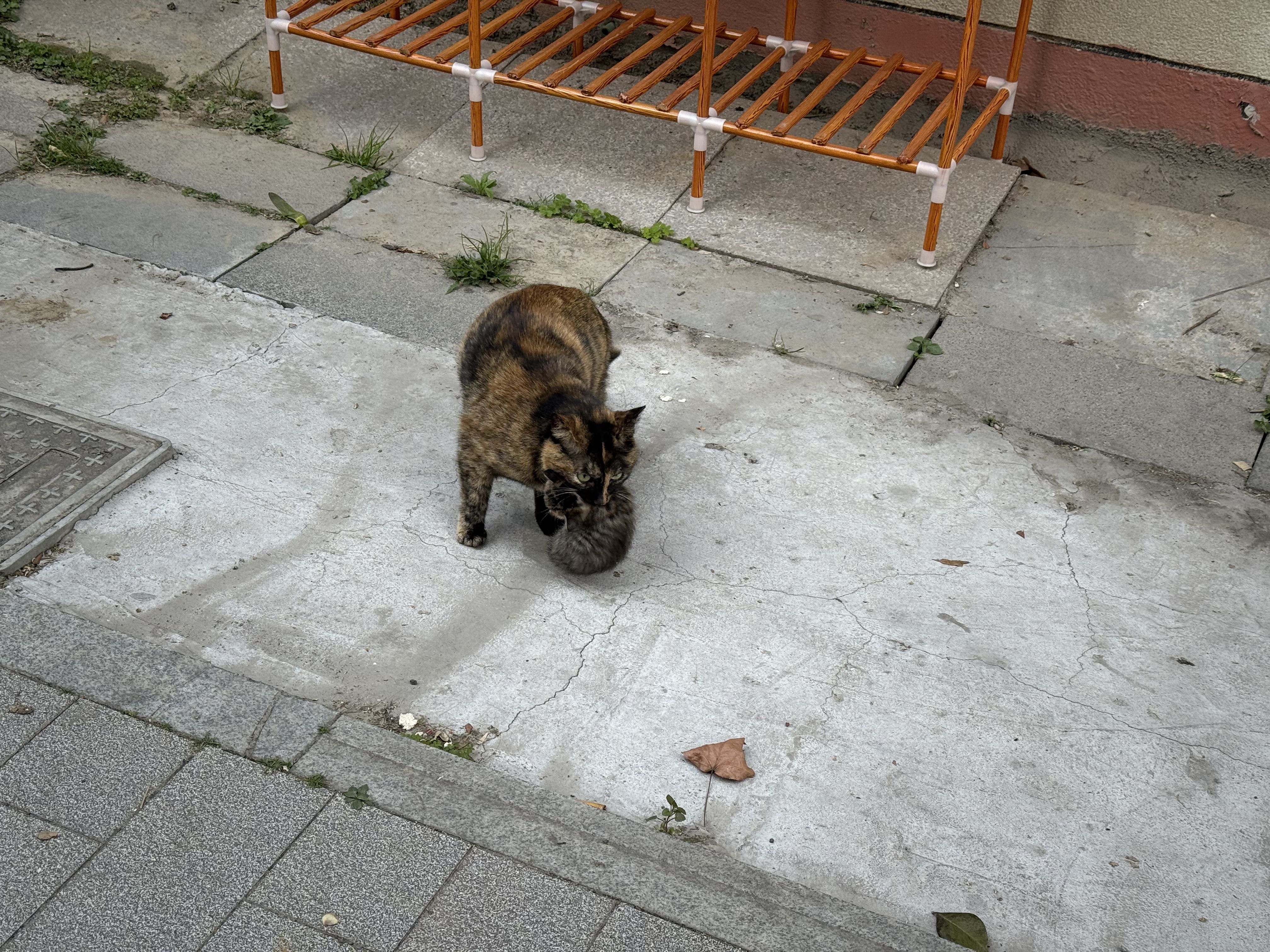 偶遇一只玳瑁叼着崽!