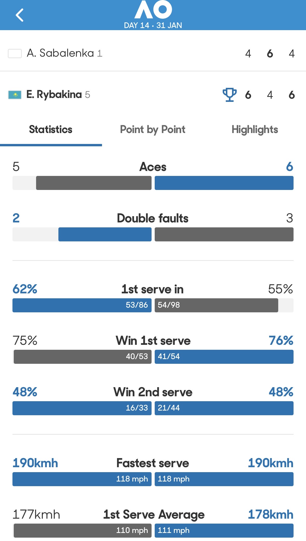 数据上平分秋色,但莱巴金娜的关键球特别是关键发球明显更胜一筹,情绪控制也是无敌,相信未来还会看到很多次她俩之间的决赛
