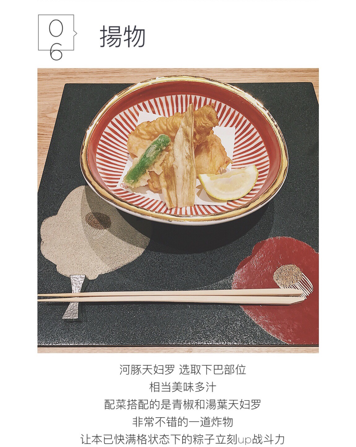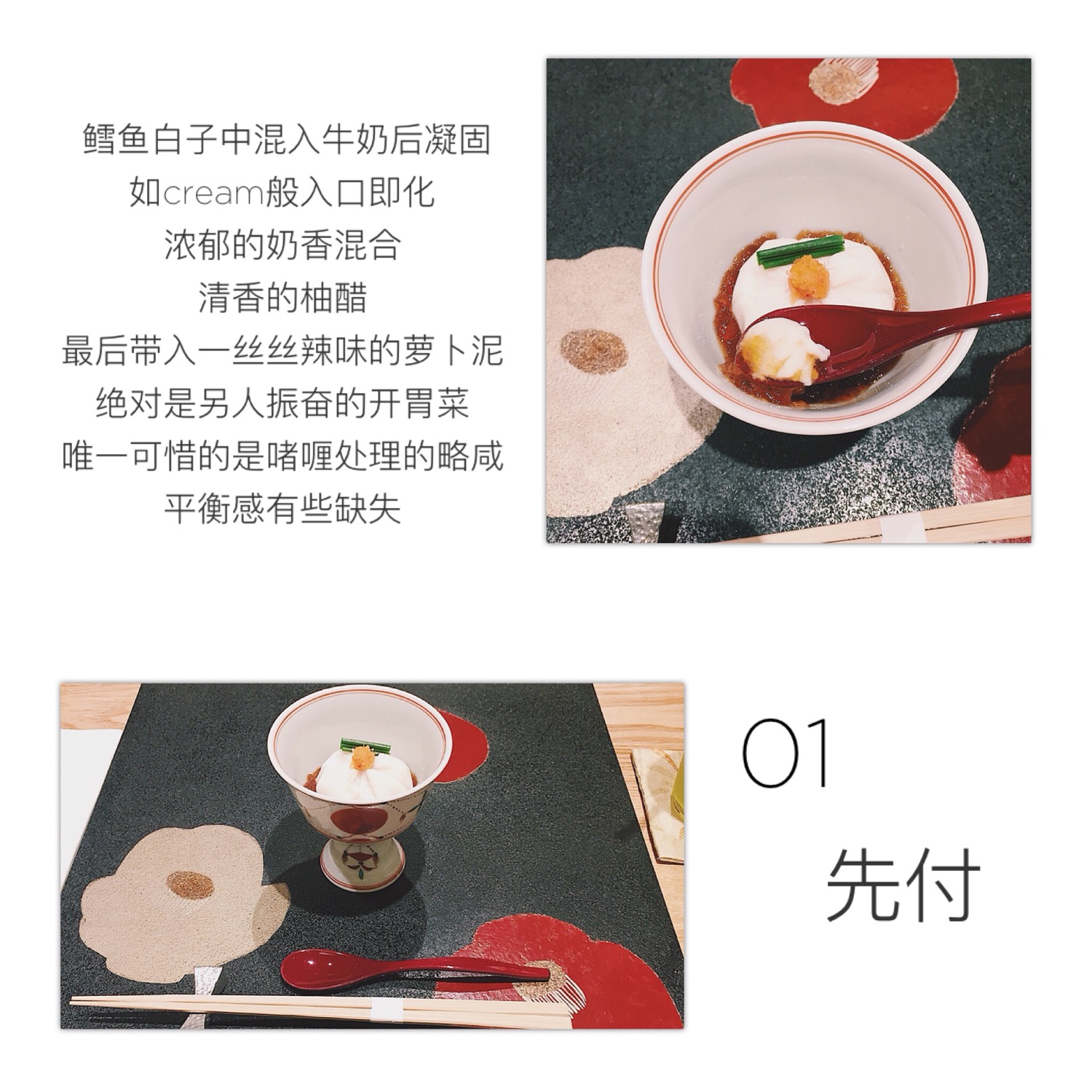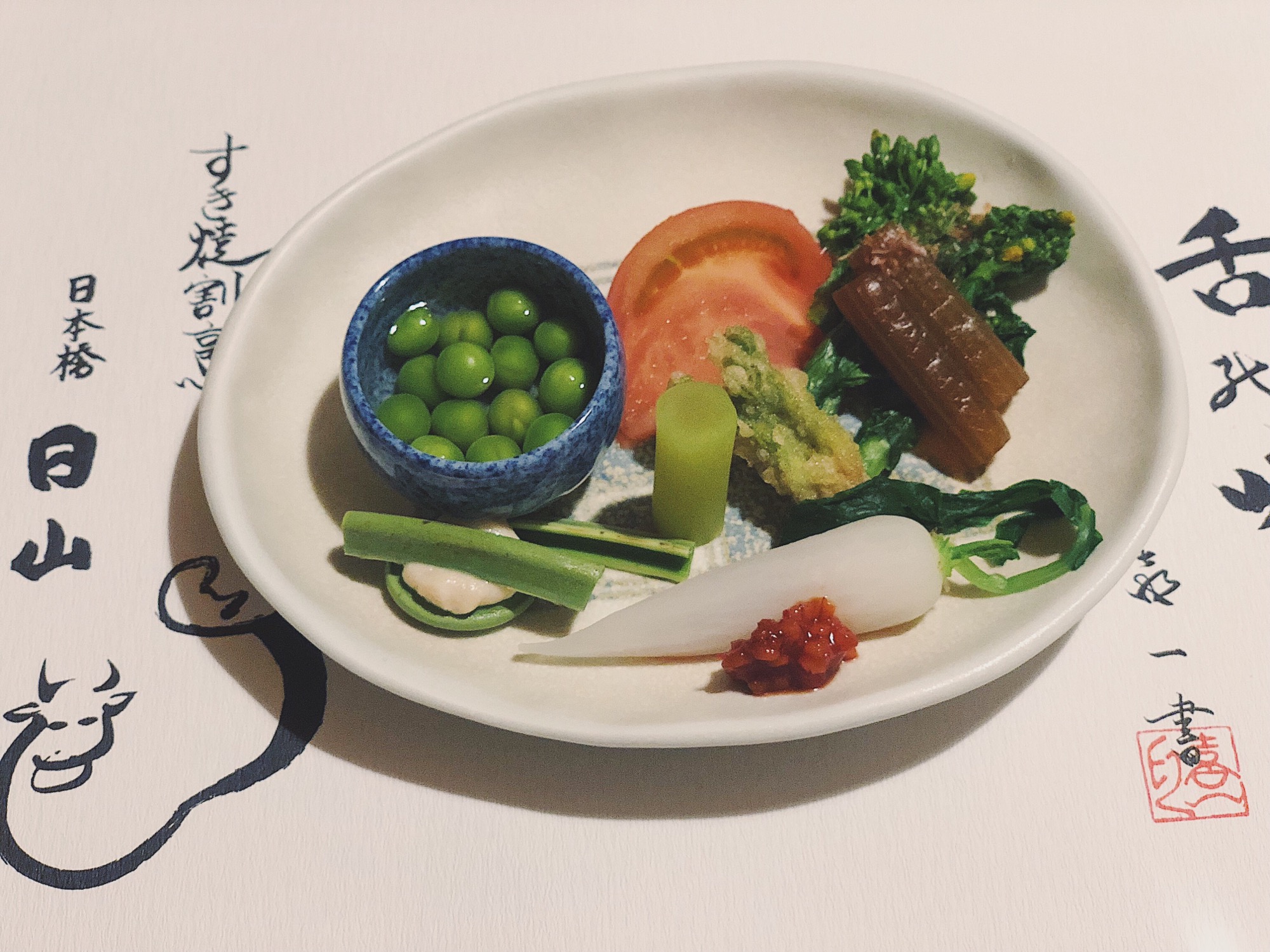开胃菜和前菜都以蔬菜呈现,纯粹自然的甜味搭配些味赠提升咸鲜口感,味赠以比较少见的赤味赠调和白味赠,相当好吃