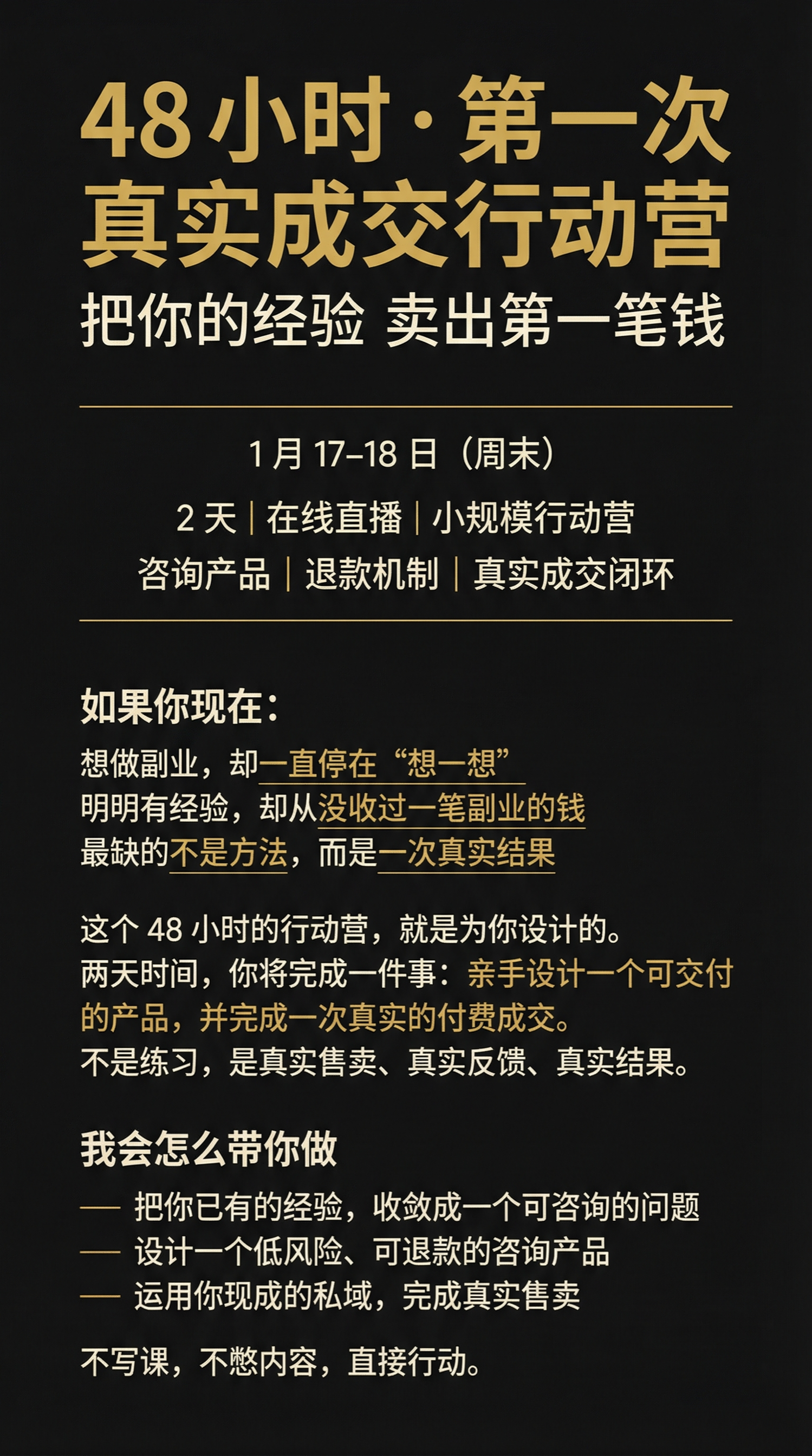 今天在星球发了一篇行动营的简单介绍,其实内心还是挺忐忑的,因为很久没有做新产品发售了,也没有提前构思太久,但我知道最坏的结果也不过就是没人报名,那也不会比我什么都没做更差,得到经验或者得到教训,都好过什么都没有得到~