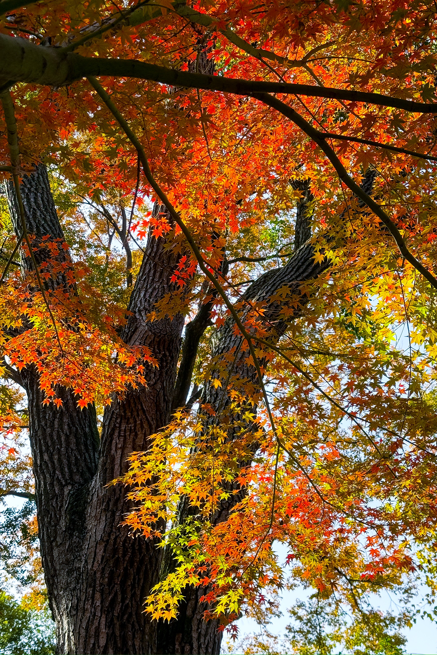 凌波桥畔的乌桕最是贪心,把秋的色谱都揉进了叶尖:新绿还没褪尽,鹅黄已漫上脉络,橙红叠着绛紫,在晴光里晕出三四重渐变,像把深秋的阳光都织进了枝叶里。红枫的艳、三角枫的柔、鸡爪槭的俏,各擎着一团秋色,在风里晃出细碎的光。