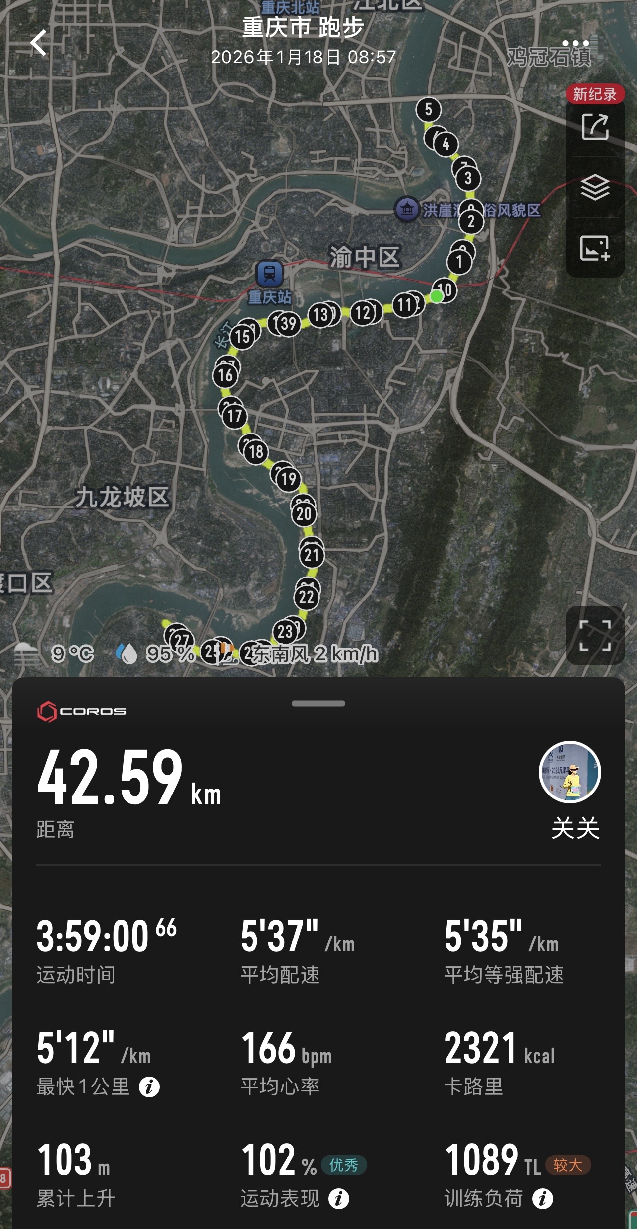 2026年,重马提前到1月开赛。经过朋友艰难地协调,又给了我赞助商名额,还拥有了自己的“私兔”。我想无论如何,这次一定要跑出成绩。所以,赛前,在操场跑了一次30公里的长距离,心里也有了一些底气。拥有私兔是一种什么体验呢?感觉自己像一台跑步机器,只需要完全信任,把自己交给对方,坚决执行对方的指令,比如什么时候吃胶喝水降速提速。他是我的教练,是我的战友,是我的领航员更是护航员。他为我提供后勤保障,还要提供心理按摩。他说:“不要走,慢一点都不要走,他说做得好就这样,你非常棒”。确实,我非常棒,pb43分钟,在2026年的重马,完成了长久以来的夙愿,终于破4了,终于有拿得出手的全马成绩。