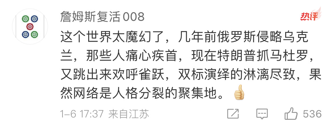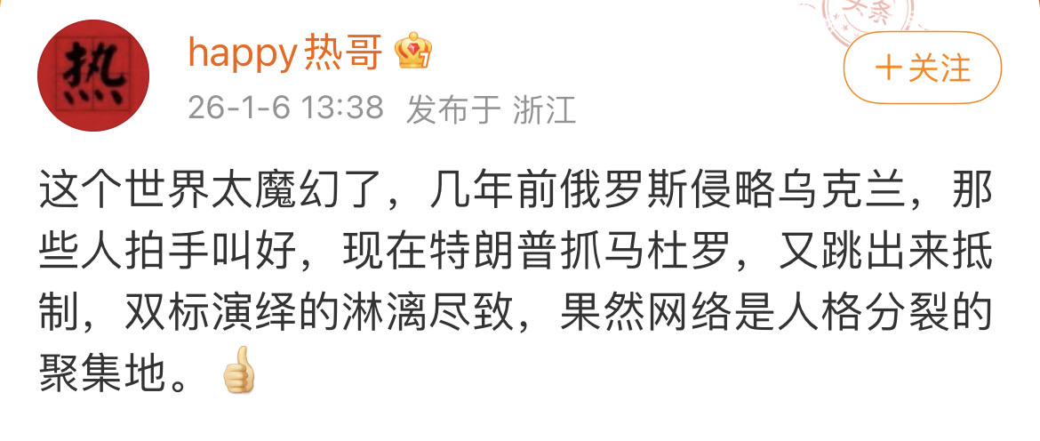 其实,川儿提供了一个很好的思路,不打仗,不劳民伤财,直接“摘桃”,大家都不怎么受影响😂我看报道说,对面也怕了,怕效仿,xx条例也不搞了。这比ew硬碰硬的强,真的,你们爱咋咋地,虚伪的政客,别影响到我的生命就好。然后还看到🐴被抓,主要是因为模仿川儿跳舞,嘲讽拉满了