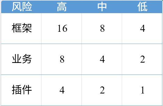 比方说,原本是框架、业务、插件三类代码。但同为框架,日志功能出错,风险比较低,而支付功能出错,风险极高。然后建一个简单的模型(如图一):