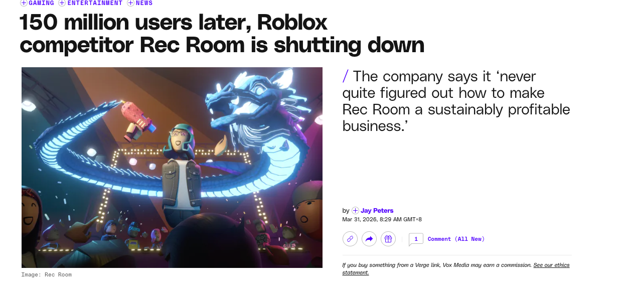 又一家当年vr/元宇宙年代的代表平台,估值到了35亿美金,有1.5亿用户的rec room也宣布关闭了……