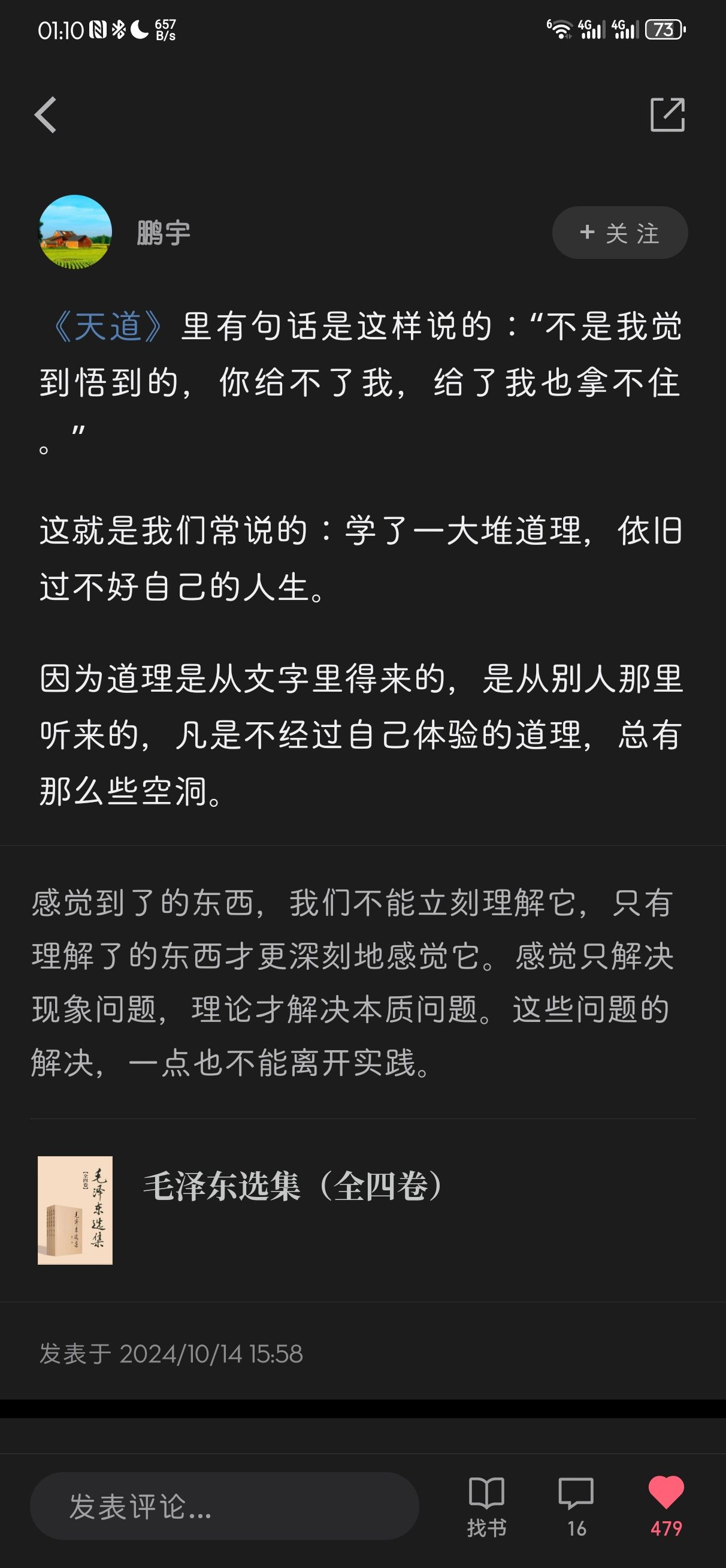 大半夜看到这个书评就非常有感触,道理得自己悟到的才有用。鸡蛋由内而外是新生,由外而内是破坏。