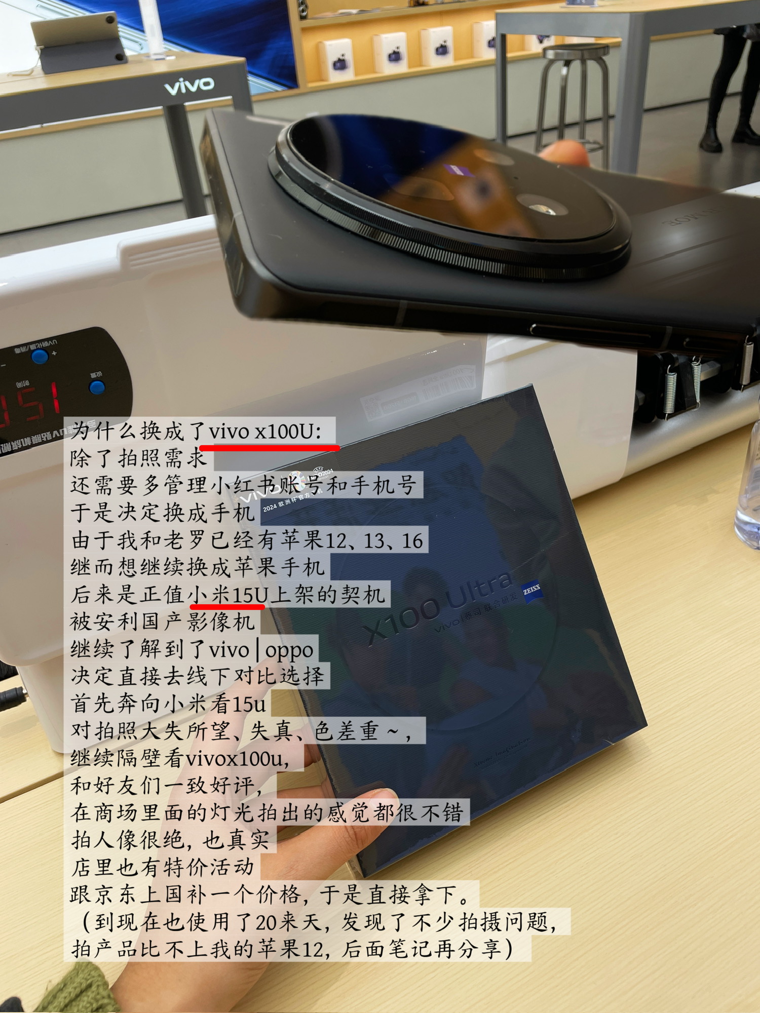 为什么换成了vivo x100U:除了拍照的需求,还需要多管理小红书账号和手机号,于是决定换成手机,由于我和老罗已经有苹果12、13、16,继而想继续换成苹果手机,后来正值小米15U上架,被安利国产影像手机,继续了解到了vivo | oppo 影像机,决定直接去线下对比选择,首先奔向小米看15u,对拍照大失所望、失真、色差重~,继续隔壁看vivox100u,和好友们一致好评,在商场里面的灯光拍出的感觉都很不错,拍人像很绝,也真实,店里也有特价活动,跟京东上国补一个价格,于是直接拿下。(到现在也使用了20来天,发现了不少拍摄问题,拍产品比不上我的苹果12,后面笔记再分享)