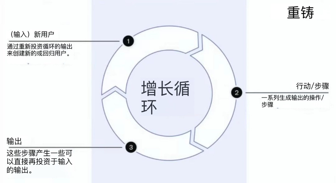 最快速增长的公司都不是通过漏斗 (funnel) 成长的,而是通过循环 (loop) 成长的。她甚至半开玩笑地说漏斗是"F 开头的脏话",应该尽量避免使用。循环的逻辑非常简单:有一个输入,比如新用户,他们在产品中执行某个动作,产生一个输出,这个输出又可以被再投资来产生下一个输入。这就形成了一个复利飞轮,不断自我强化。