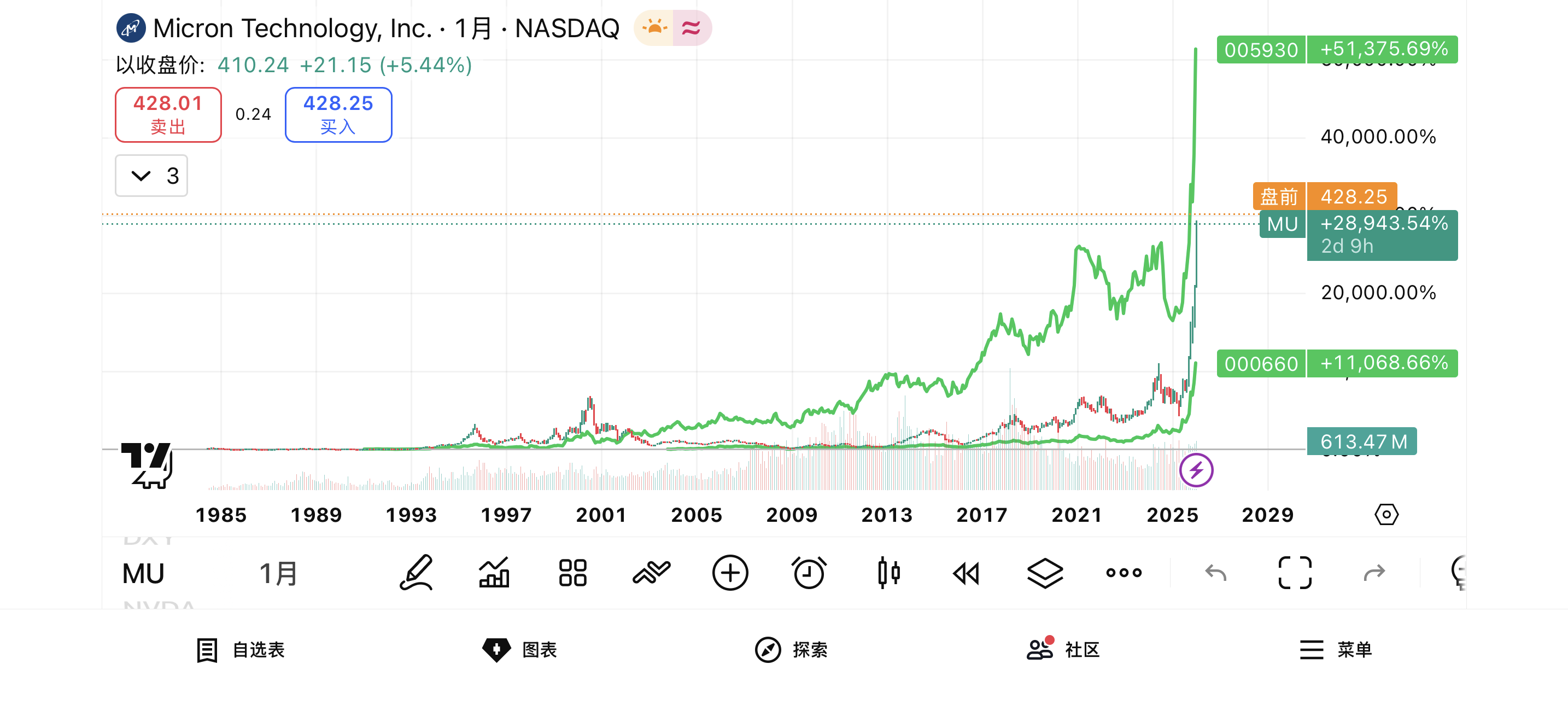 图片是美光、海力士、三星电子存储三巨头上市至今累计涨幅对比(trading view只有从1980年左右开始的)