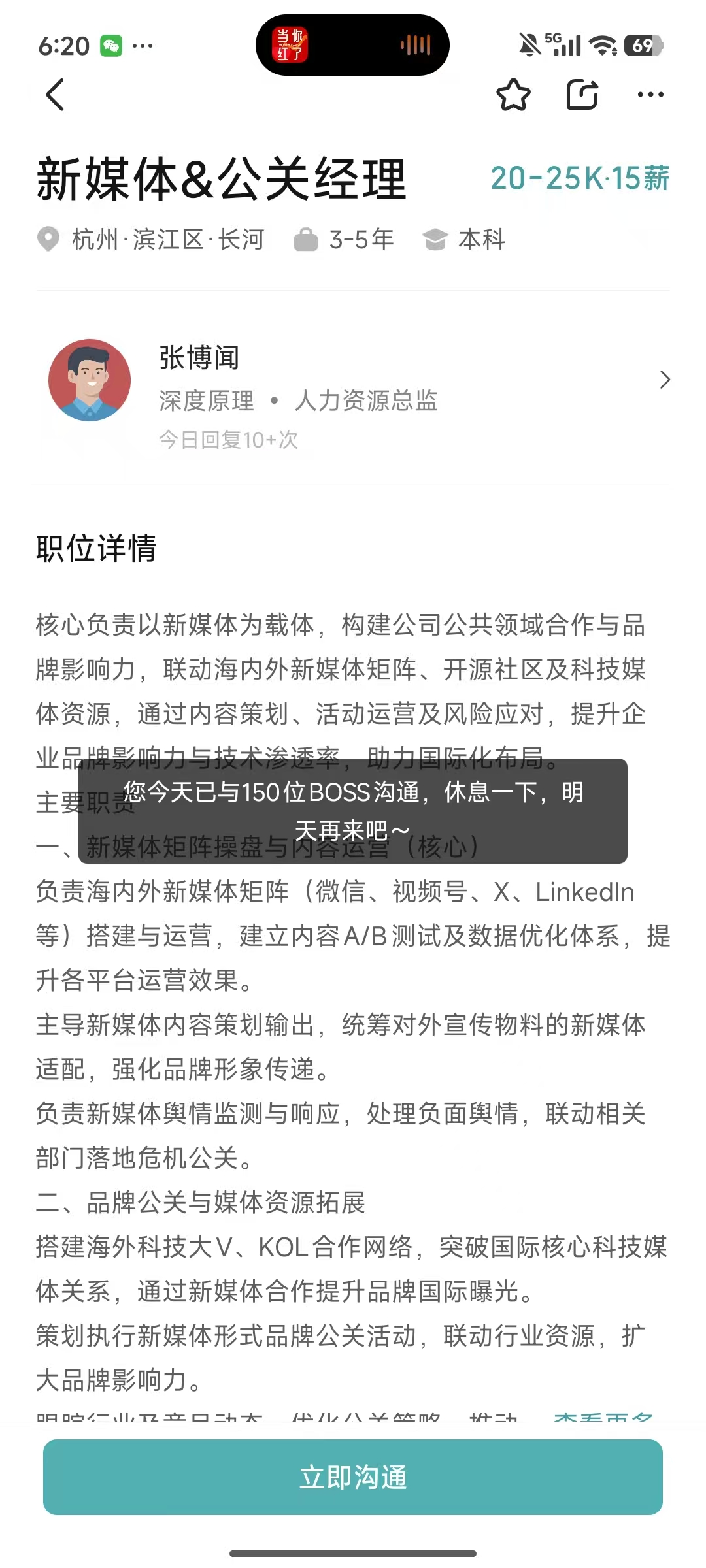 BOSS直聘求职者一天打招呼上限是150条信息。