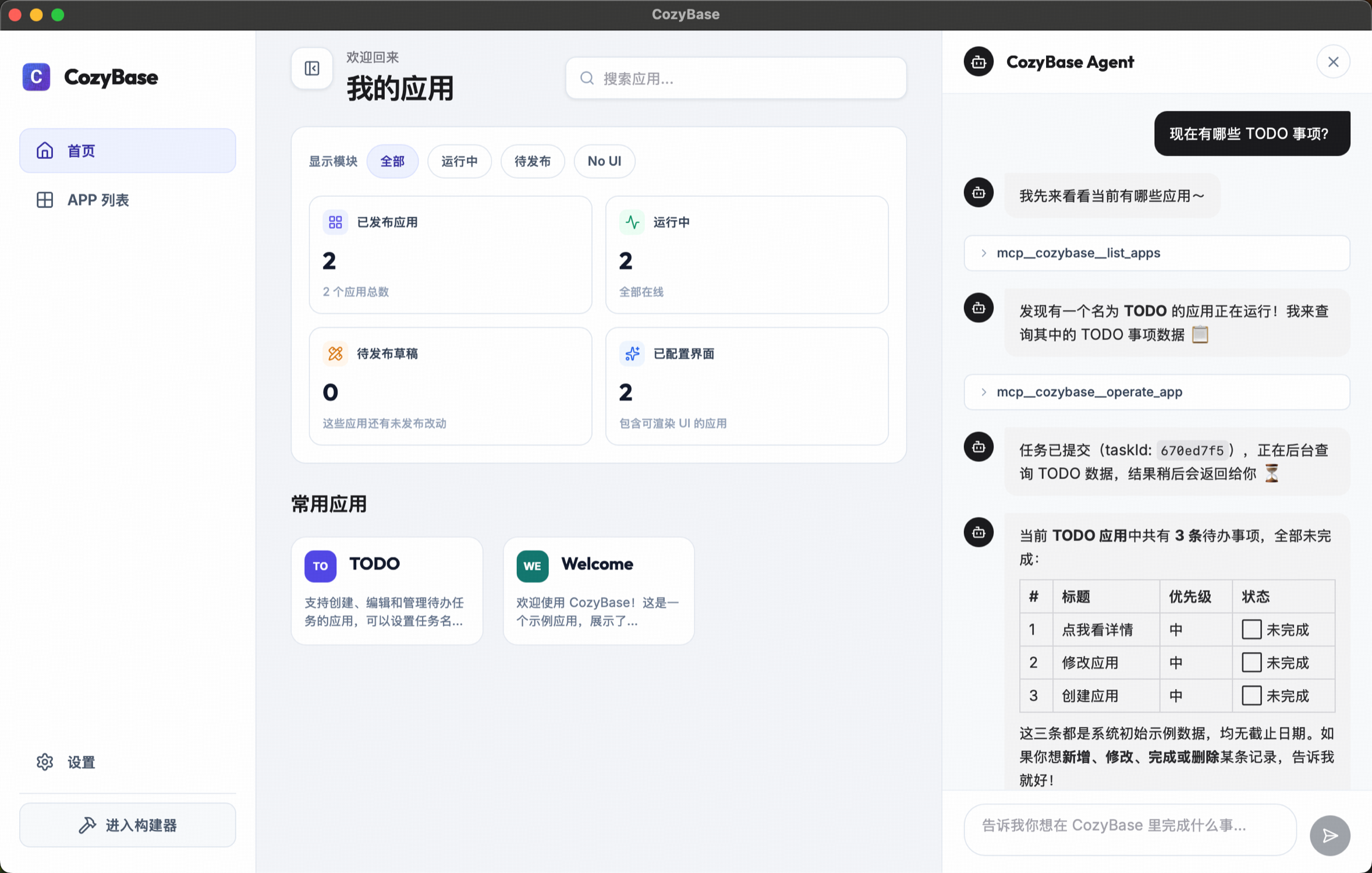 CozyBase 是一个类似 Supabase 的、面向 AI Agent 的本地 BaaS 平台,通过它你可以用自然语言描述应用的需求想法,由 AI Agent 来进行实现。换句话说 CozyBase 就是属于你自己的 APP Store,你可以让 Agent 定制化地满足你的需求。