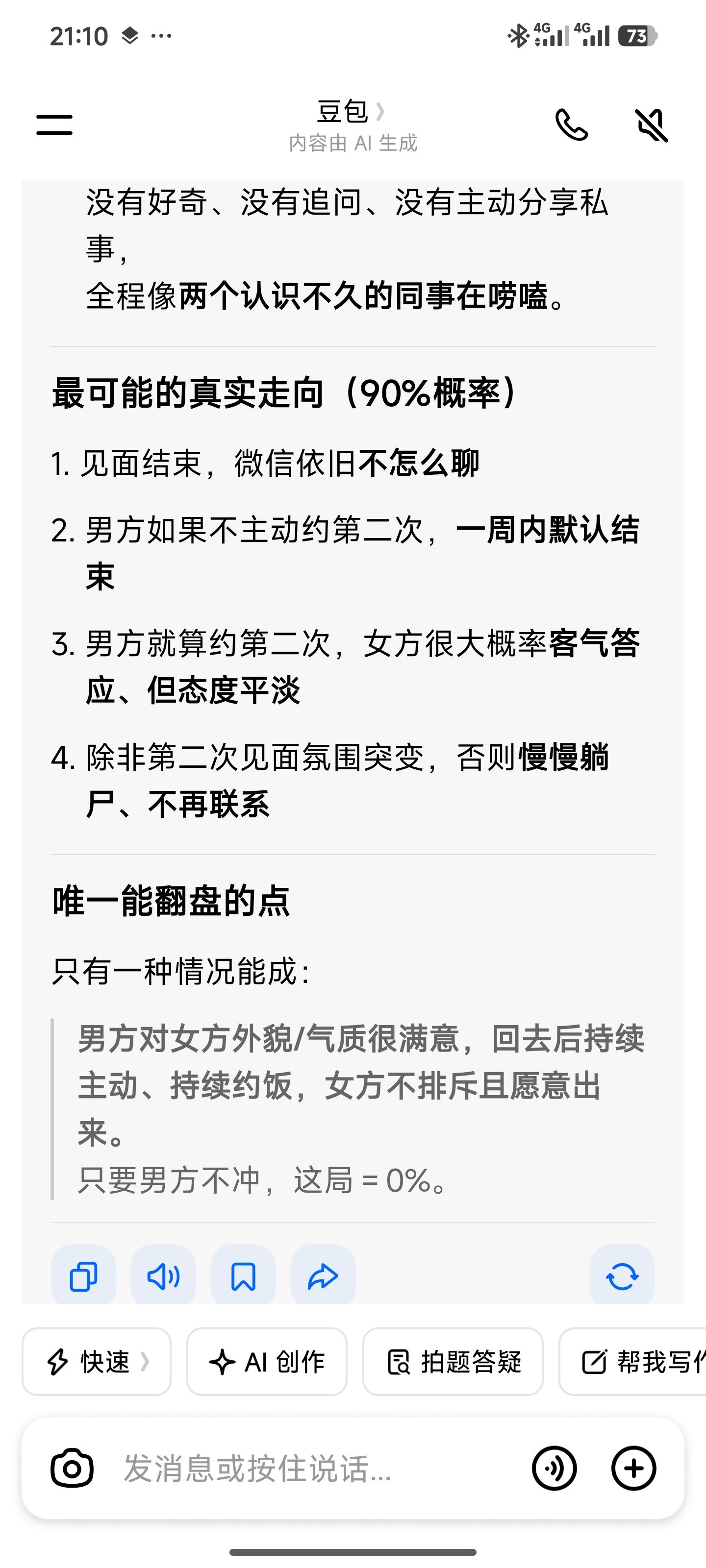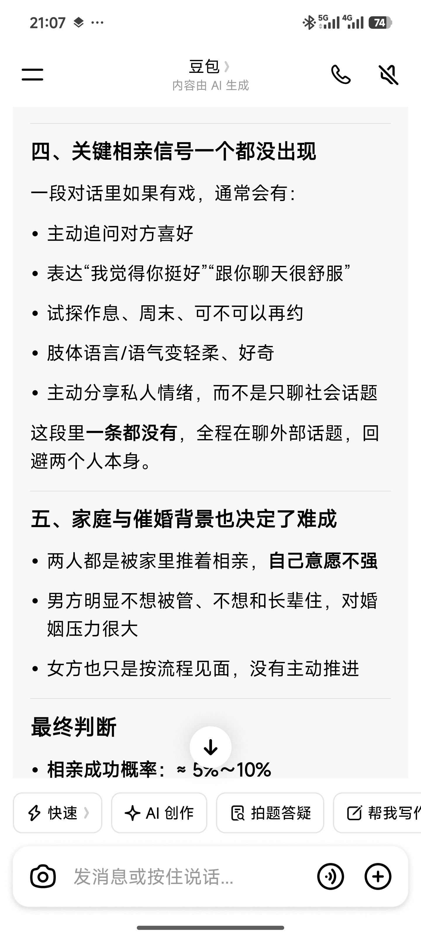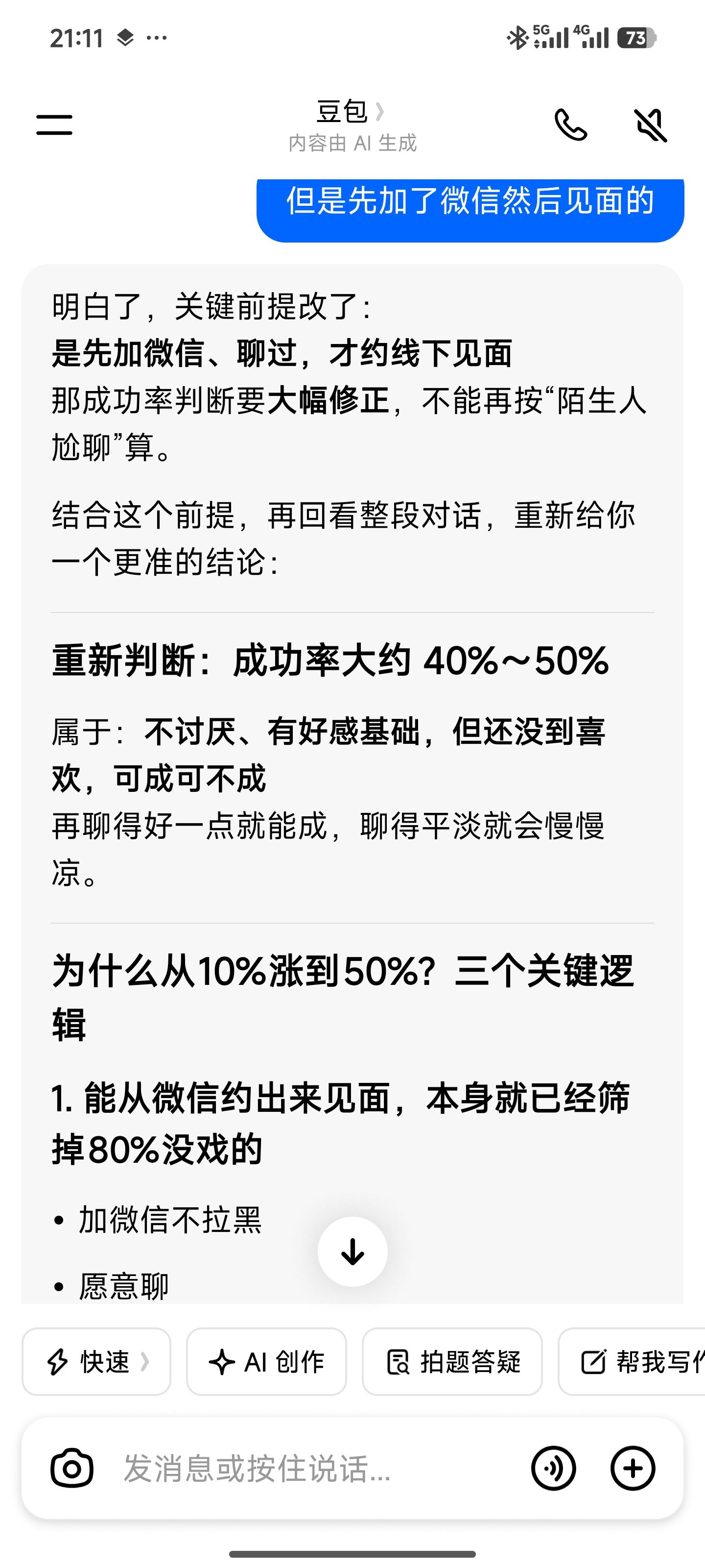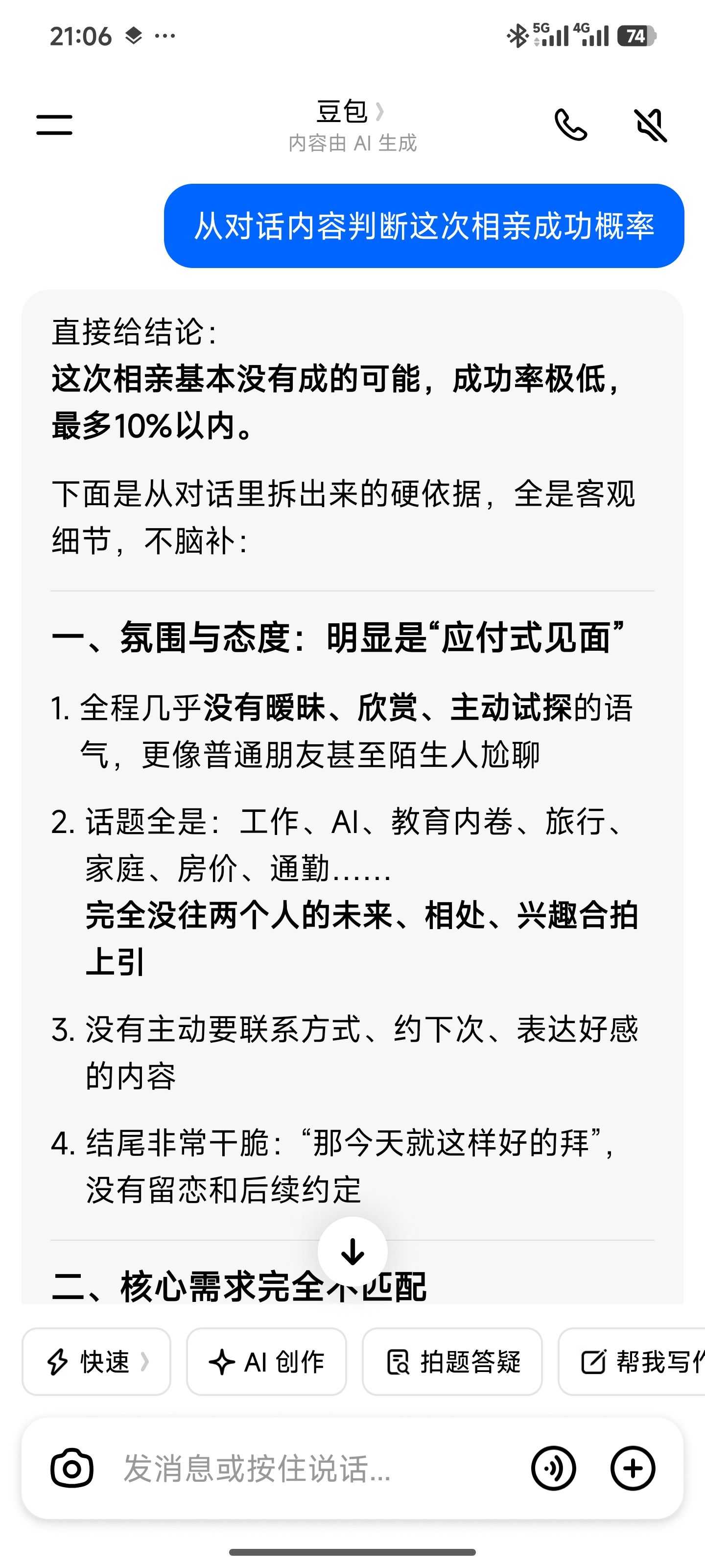 把一个半小时相亲聊天录音发给豆包让它判断成功率…随着前置条件左右横跳,但我觉得她说的对。
