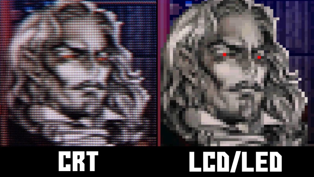 更著名的是对比里另一个例子,月下德库拉的红眼其实只有一个像素点的红色,但CRT上看起来变成了深邃可怕的红眼睛。