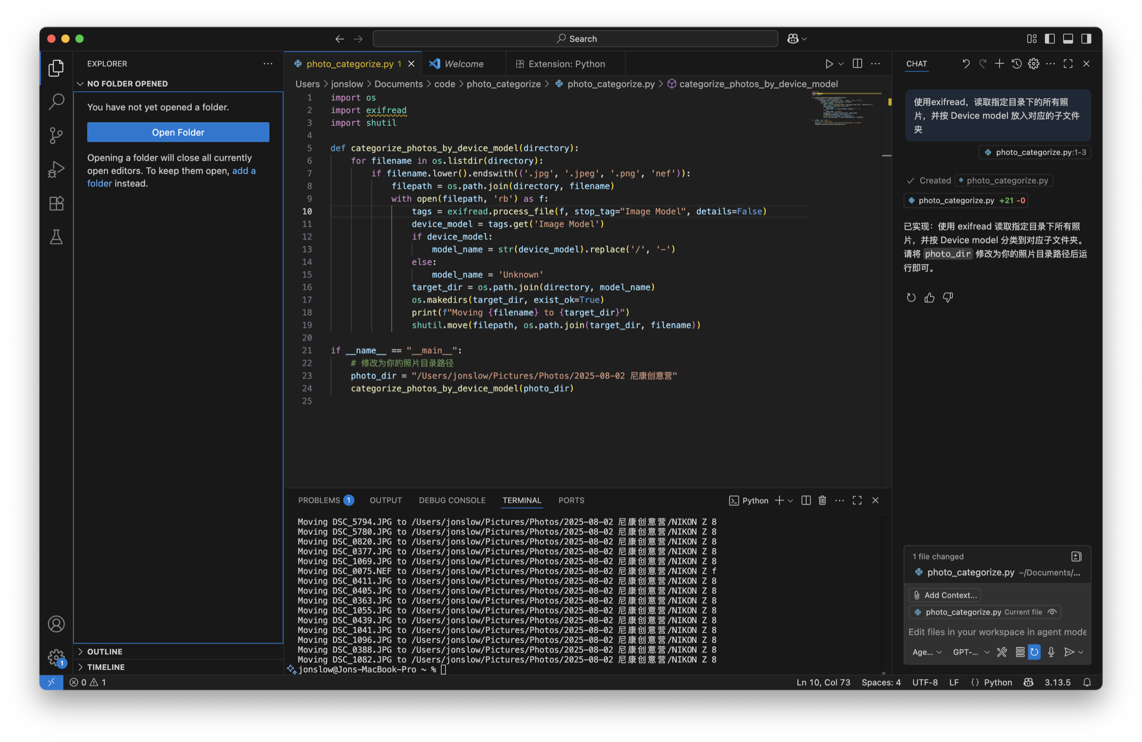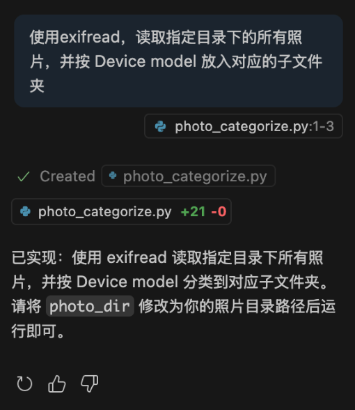 AI 编程初体验:去尼康创意营用各种不同的相机拍了几千张照片,想按机型归类到对应的子目录中。使用 VS Code 自带的 Copilot 生成了一段 Python 代码,简单review 并手动加上尼康的'nef'格式,全程2分钟稿定。