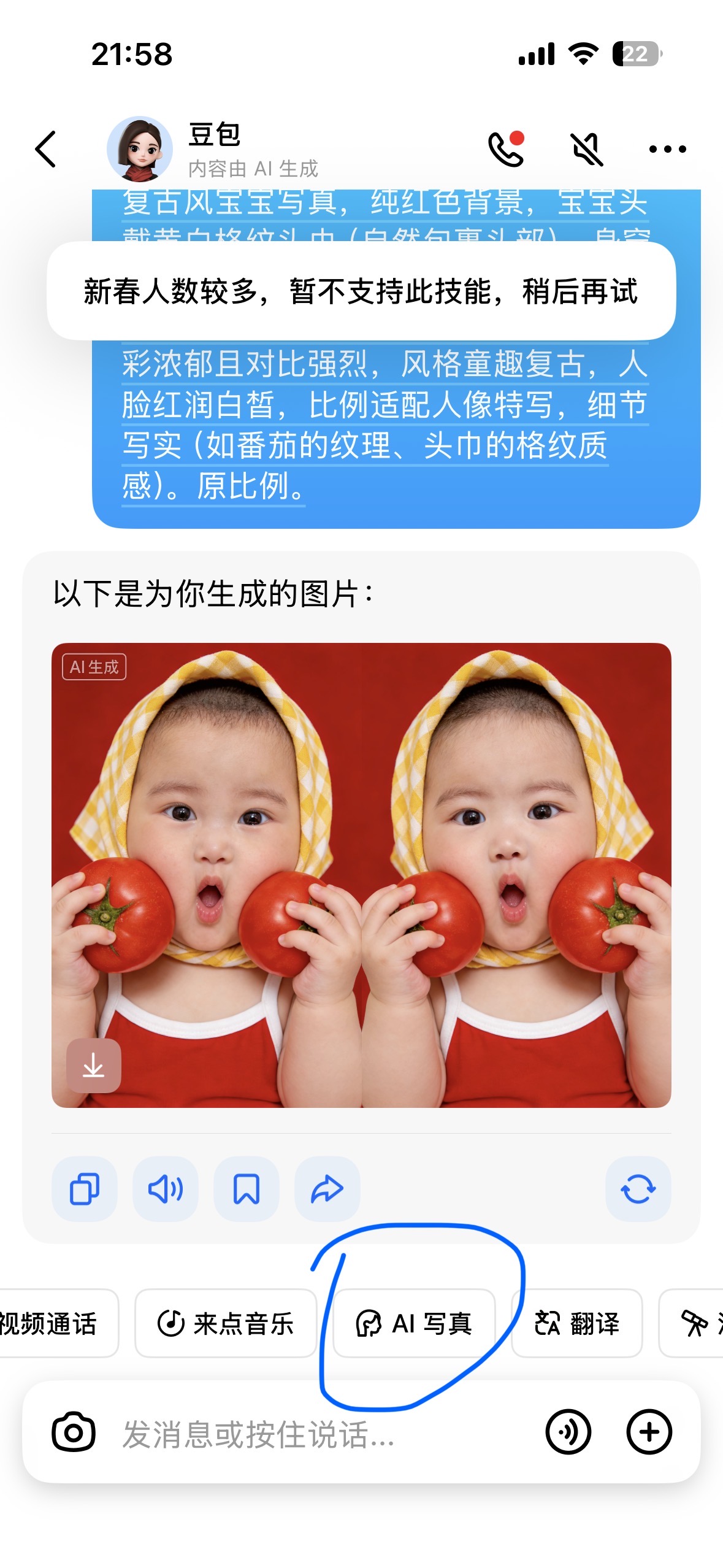 好吧,现在连AI写真也“春节人数较多 暂不支持此技能”,就不能给请求排个队什么的么? 直接暴力关掉?