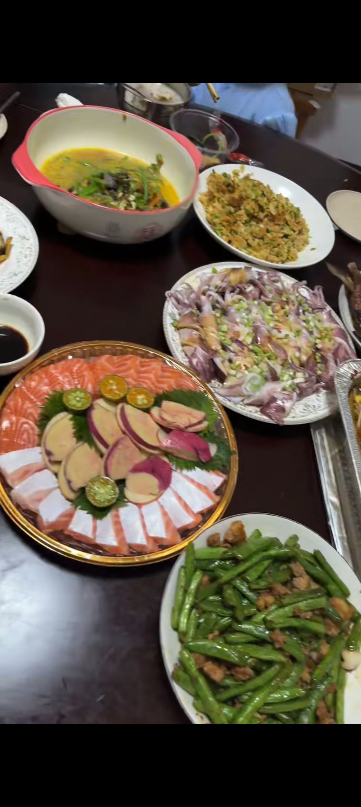 鹅肝三文鱼清盘,清蒸鲜鱿,肉沫炒豆角
