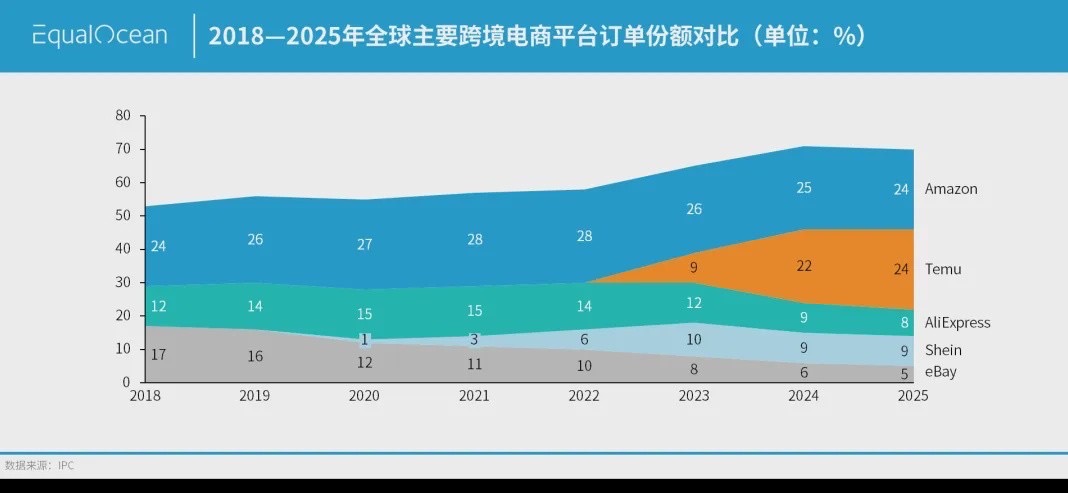 “根据国际邮政公司(IPC)2025 年的调研数据,Temu 在全球跨境电商包裹量的份额已达到 24%,在数值上与亚马逊持平。这意味着,Temu 和亚马逊两家平台合计占据了全球跨境电商包裹的近一半份额。上线于 2022 年的 Temu,仅用三年时间便达到了亚马逊二十年的积累水平。”