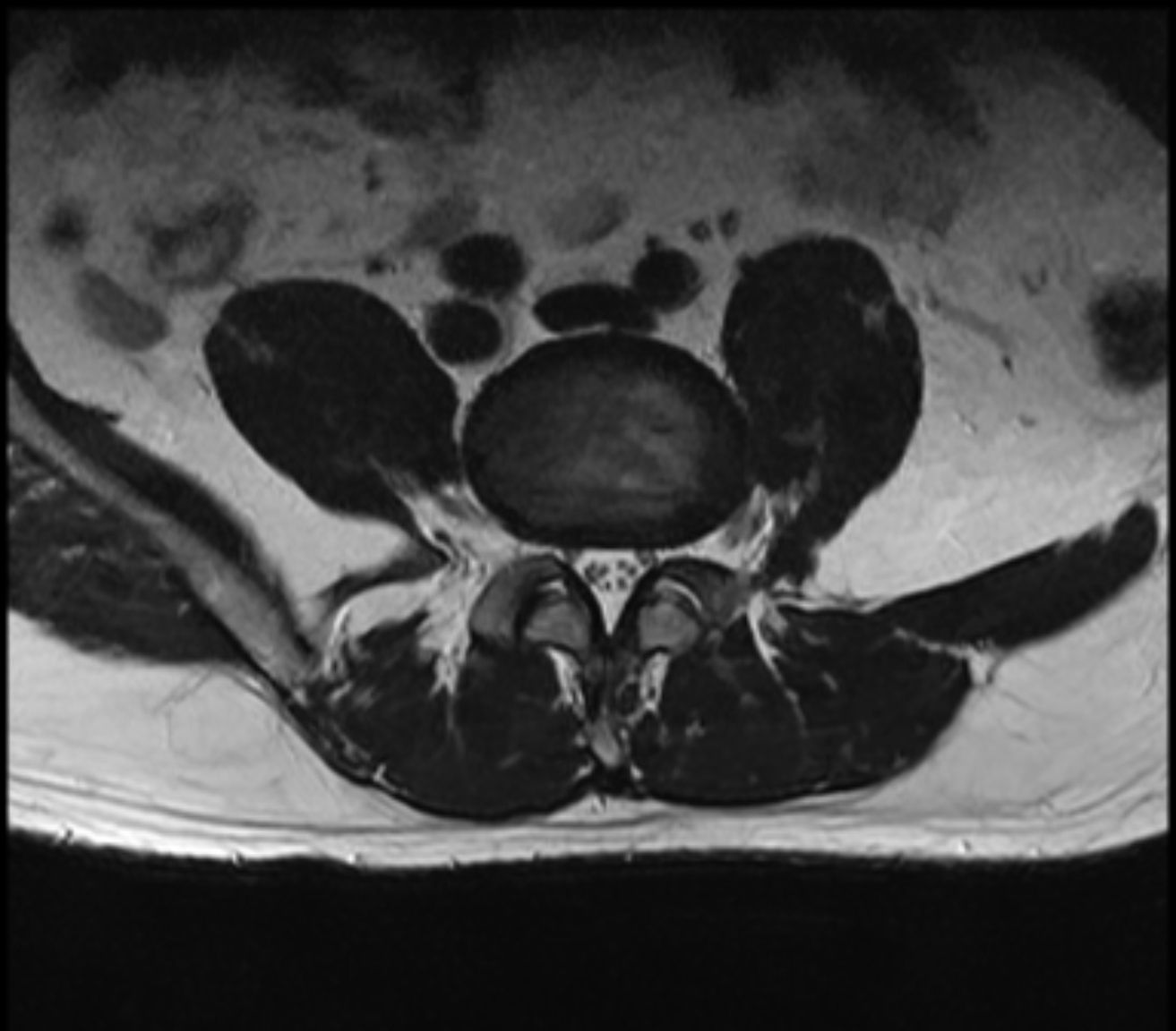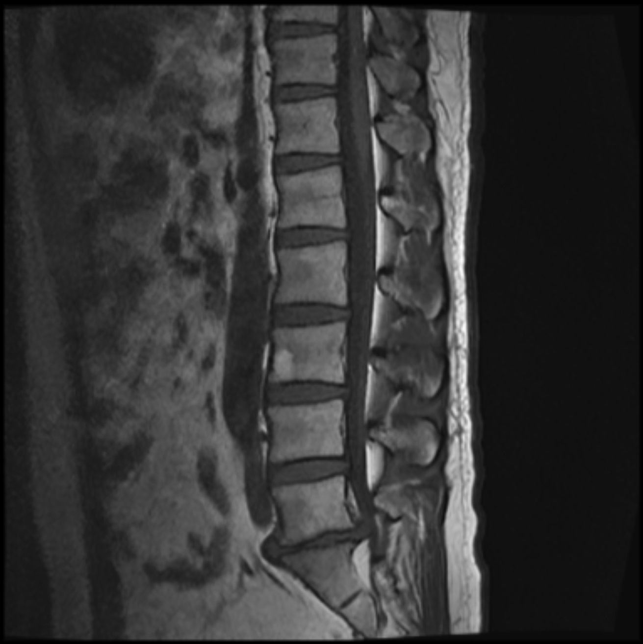 腰椎生理曲度变直 , 椎体排列尚整齐 ; 腰3椎体偏前侧见 0.9x 1.4cm的椭圆形较高信号灶 , 压脂后信号减低 , 余所示 椎体信号未见明显异常 , 各椎体边缘骨质增生改变 , 骨性 椎管未见明显狭窄 ; 腰5/聶1椎间隙变窄 , 相对缘终板面略 毛糙 , T2WI/FS信号稍高 ; 腰5/髓1椎间盘向后明显突出 致局部椎管变窄 , 马尾终丝受压 ; 腰3/4、4/5水平椎间盘 向周围轻度膨隆 , 硬膜囊略受压 ; 余圆锥、马尾形态、信 号未见明显异常。