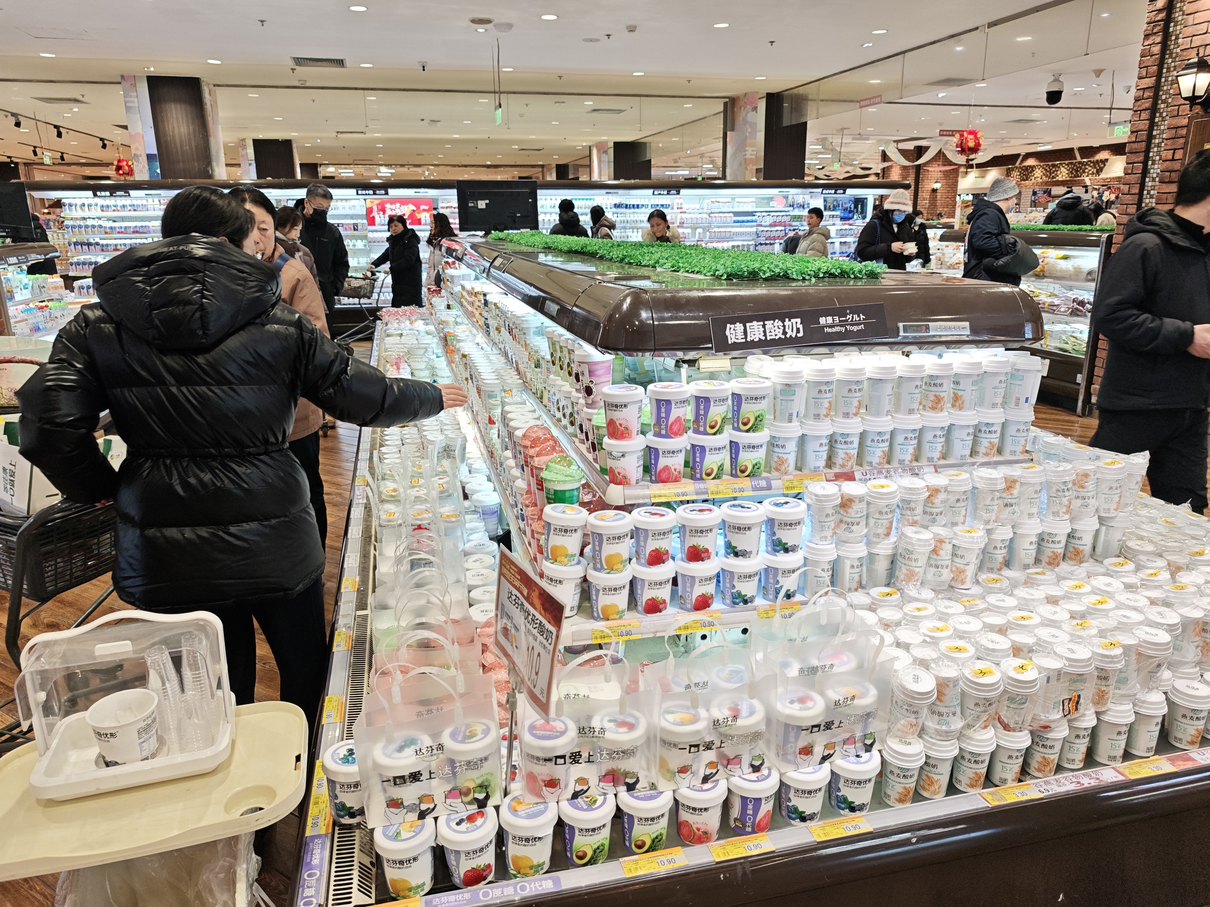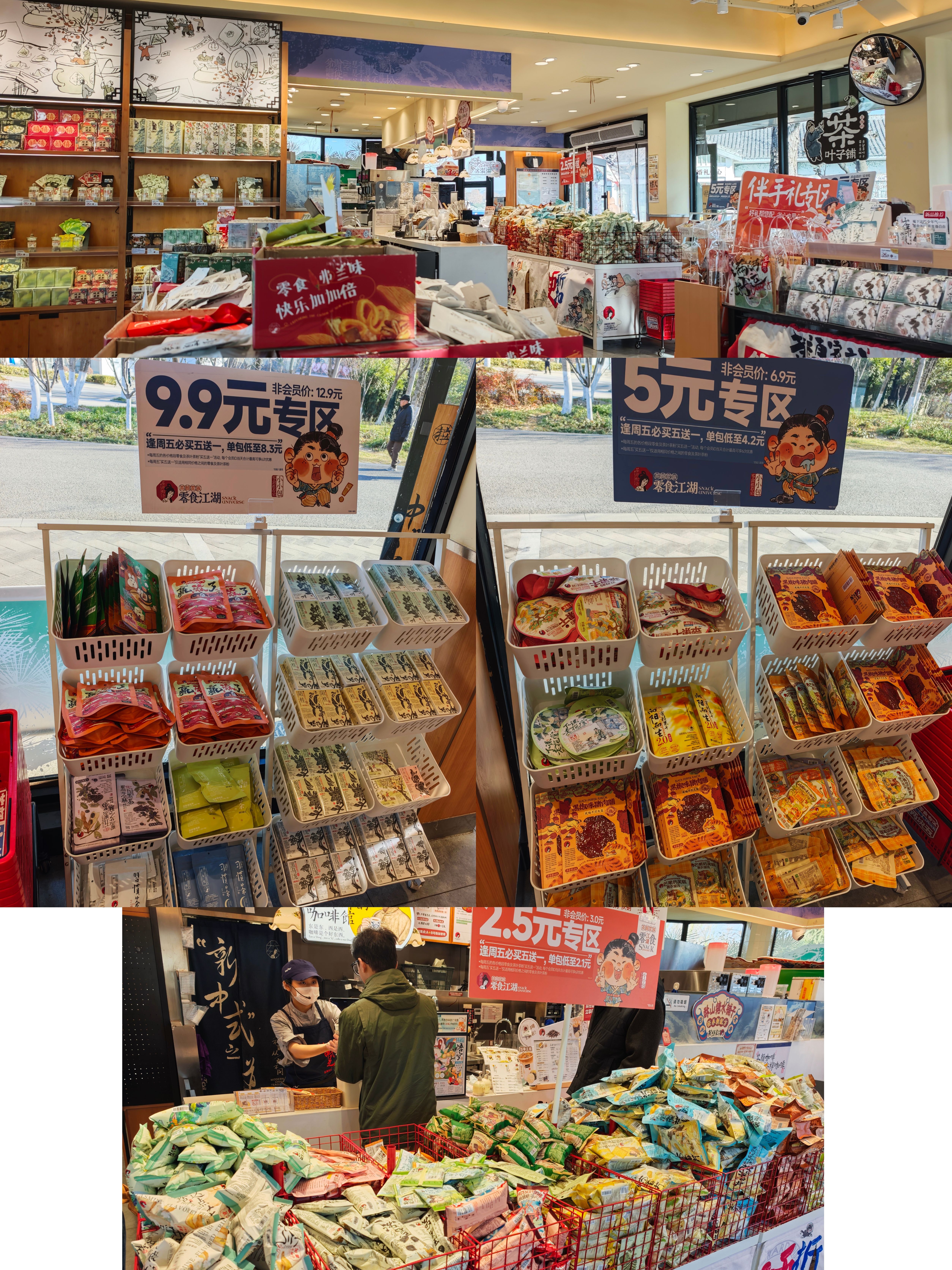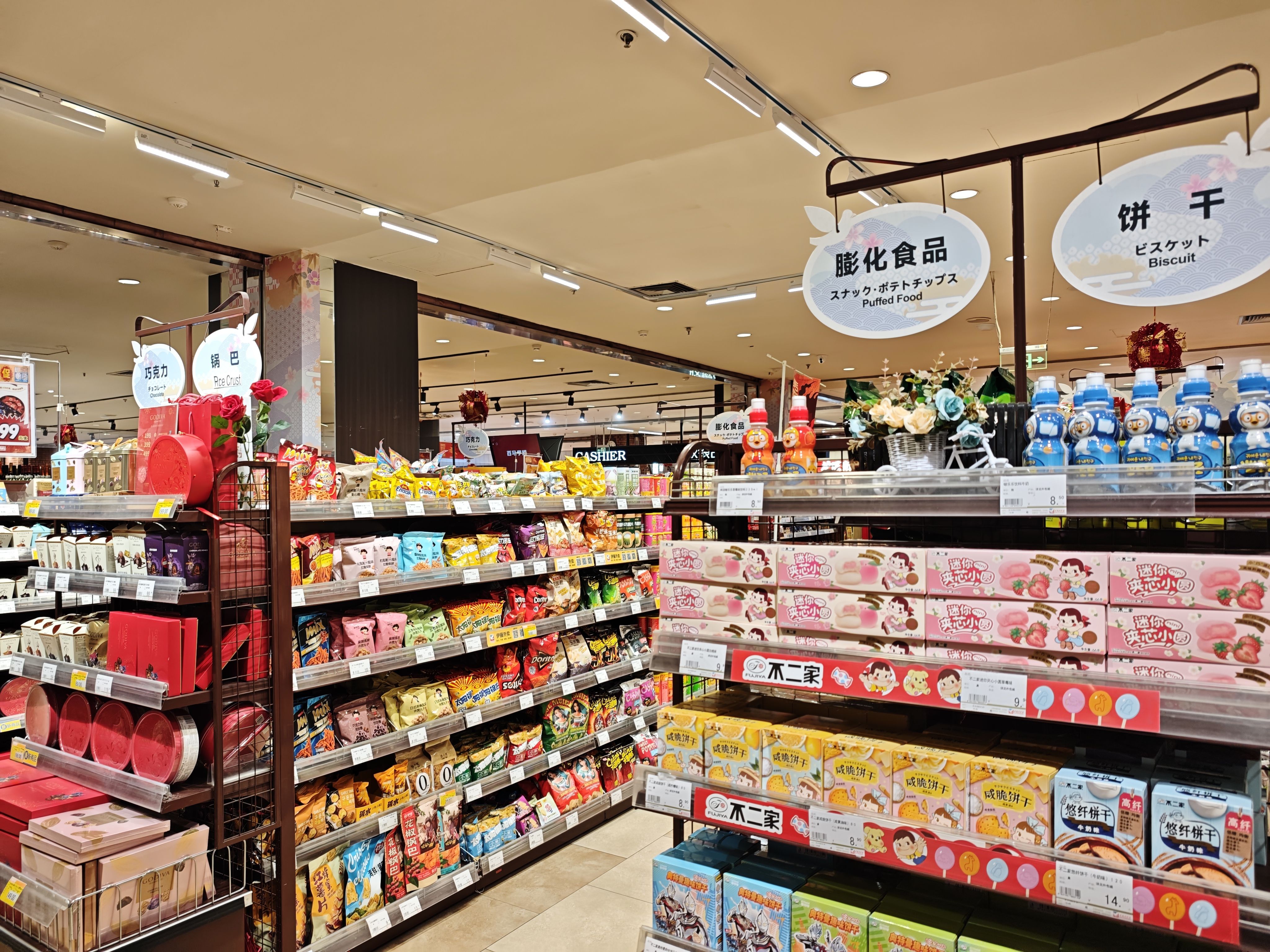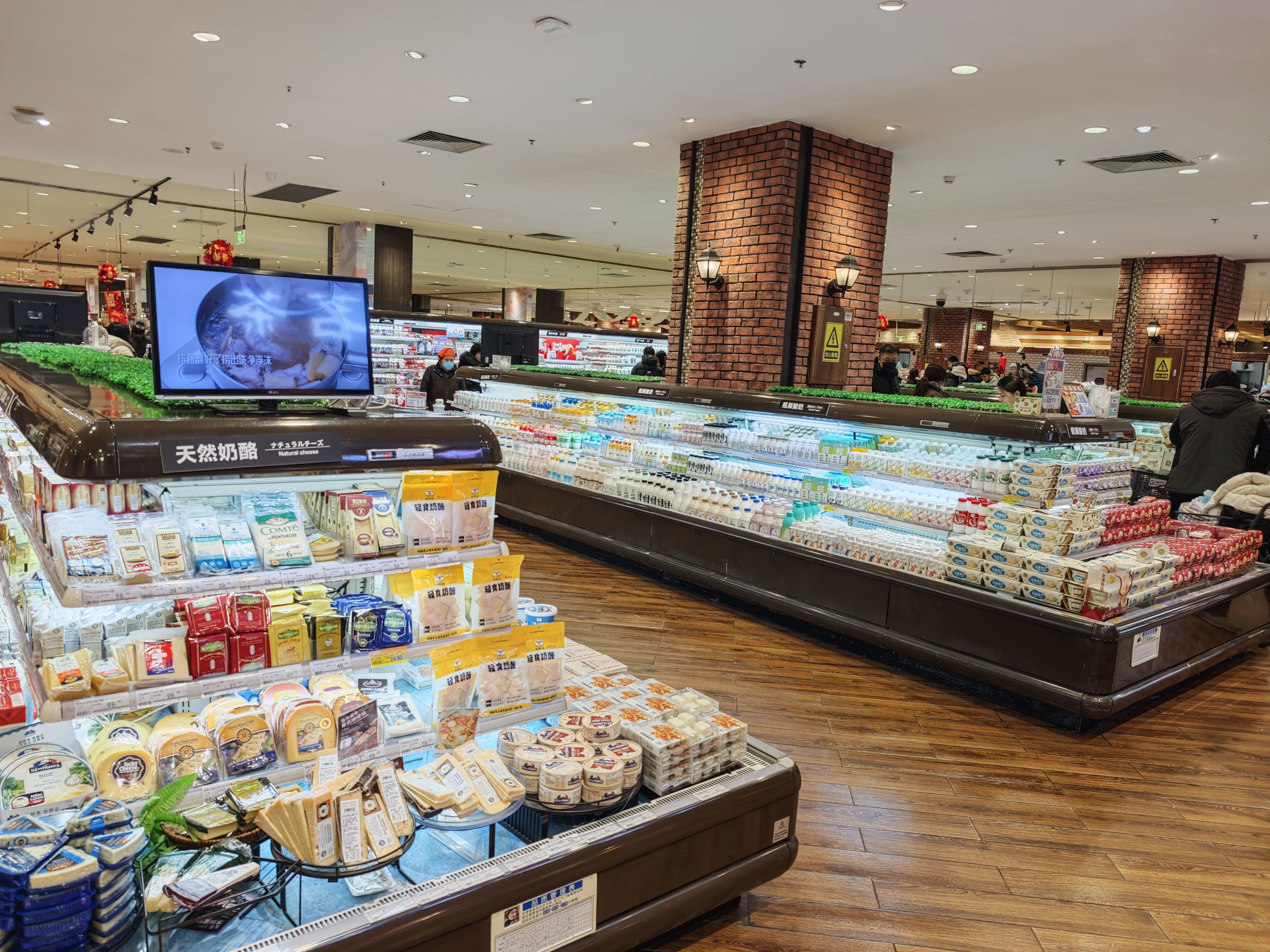 具体来说: 进门年节礼盒-临期出清-果蔬-冷藏肉类-冷藏奶制品-常温水饮-休食(货架节数最多)-非食消耗品(厨房+卫生间清洁)-粮油调味-收银台保健奶粉及个护(高货值防盗)+糖巧点心(小件顺手带一件)