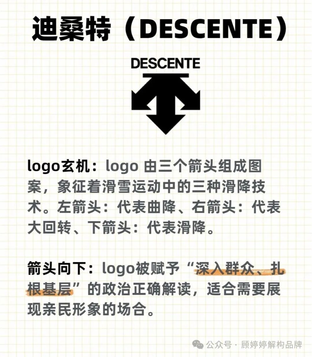 品牌故事还是得靠自己讲,本来向下的箭头代表下降、下滑,换个角度解释成“深入群众、扎根基层”,整个感觉就不一样了。