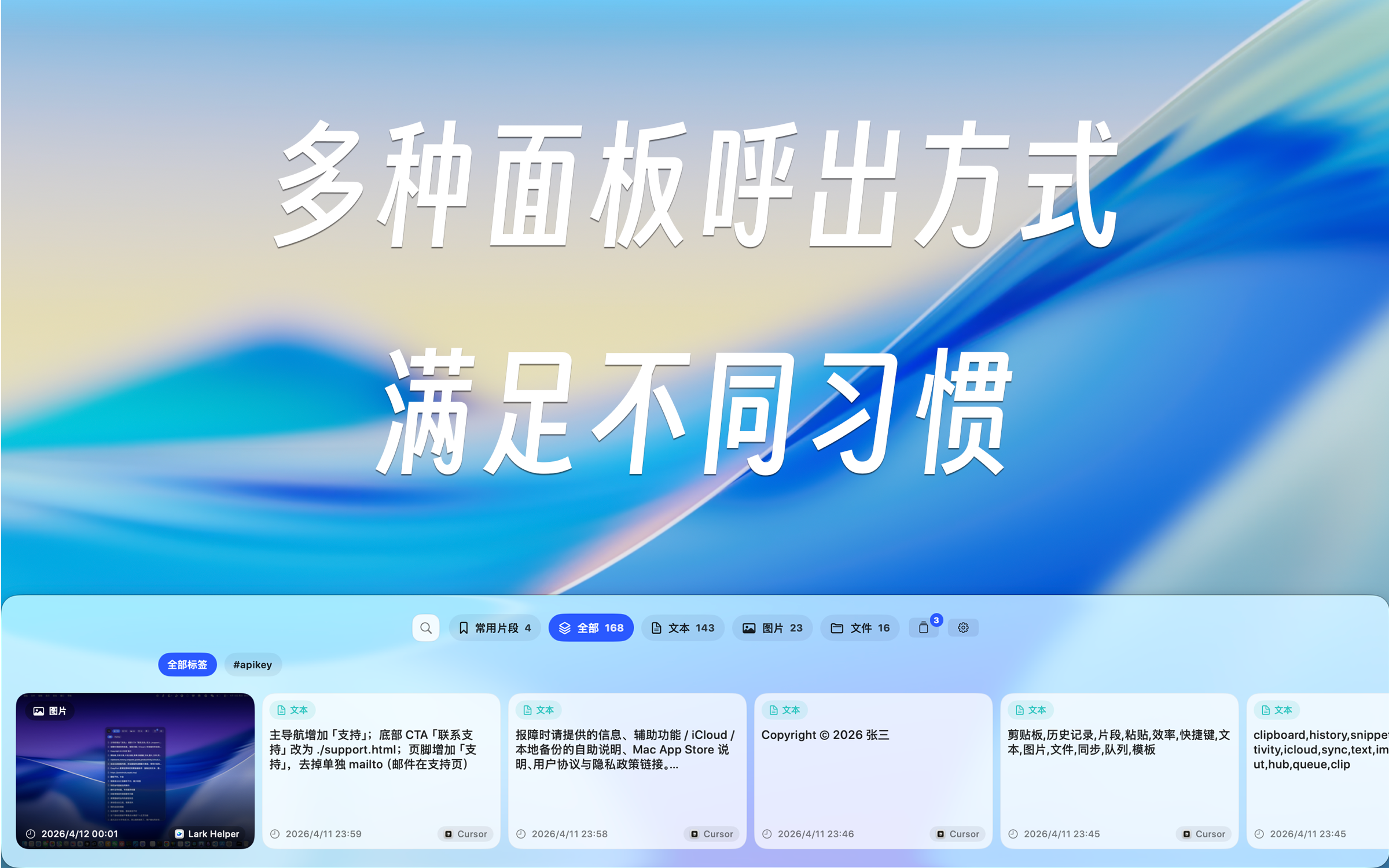 支持多种形态呼出,支持一键回填,自动粘贴到当前使用的应用。