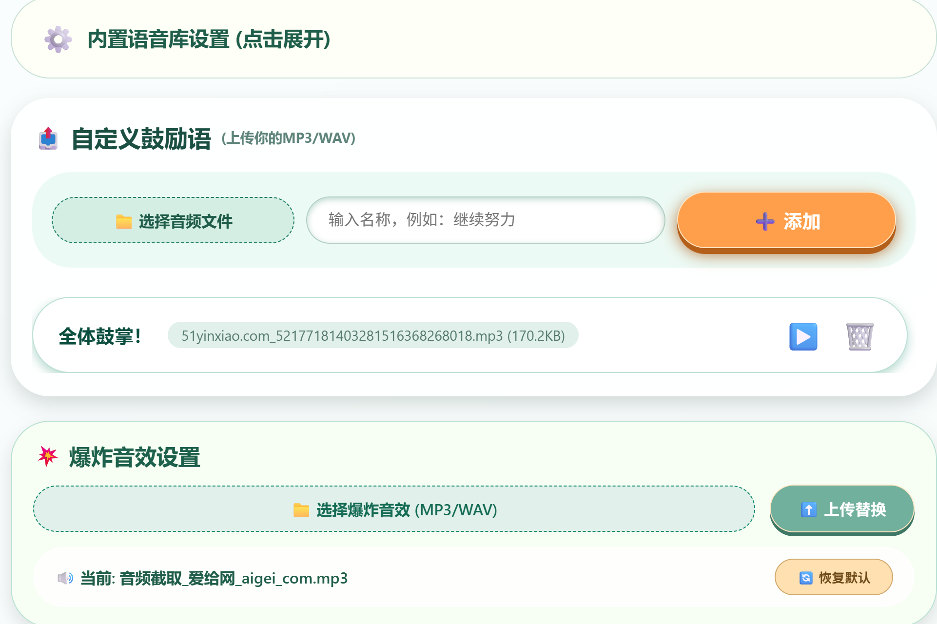 我做了一个课堂上使用的随机鼓励网站,初版完成,连续提了几个需求:烟花效果、自定义音频、自定义爆炸音效、勾选语音库等,弹无虚发,属于是有求必应了!体验了一把甲方的快感。