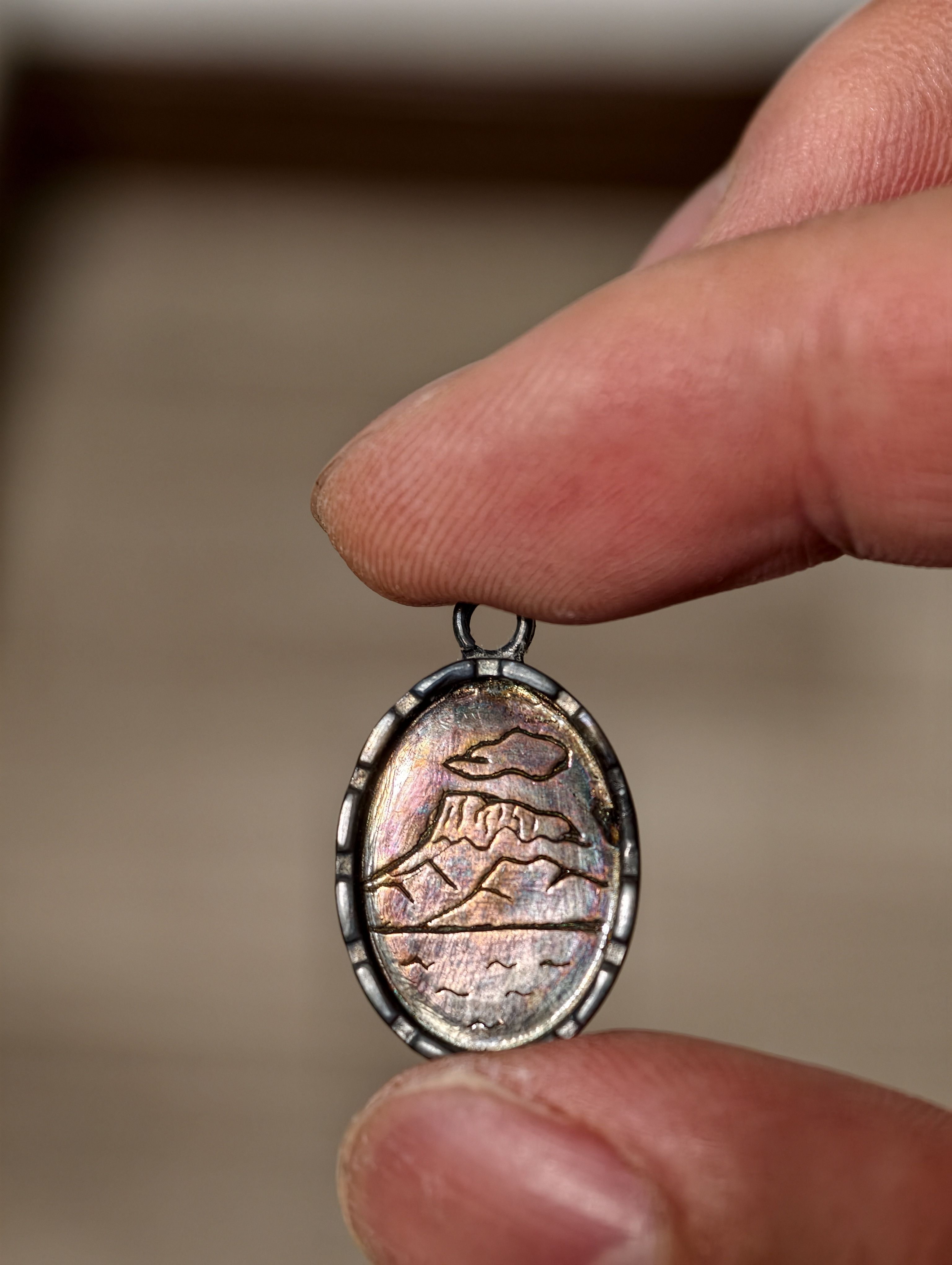 明天要搬家,晚上一直在收拾东西。刚刚翻到几年前跟同事去手工店自己做的银饰。上面刻的图案是泸沽湖和旁边的一座山,如今已经氧化发黑了。