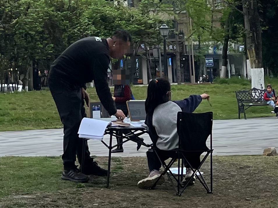在公园里支上露营桌和露营椅写作业,很难说这是松弛还是紧绷