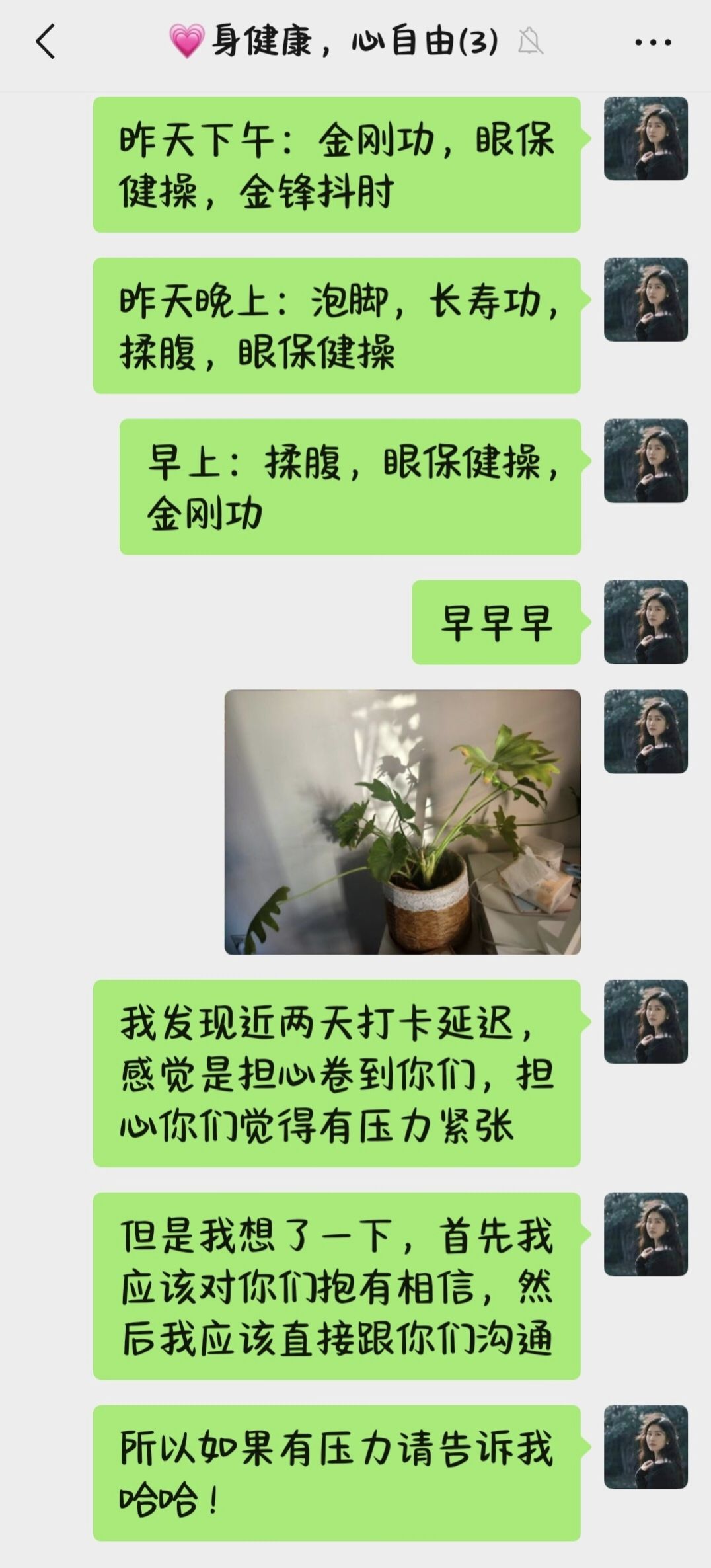 这周拉了一个小小的3人养生打卡群,群聊从一开始层出不穷的“你真棒”,到现在也有“我真棒”出现了,真棒!