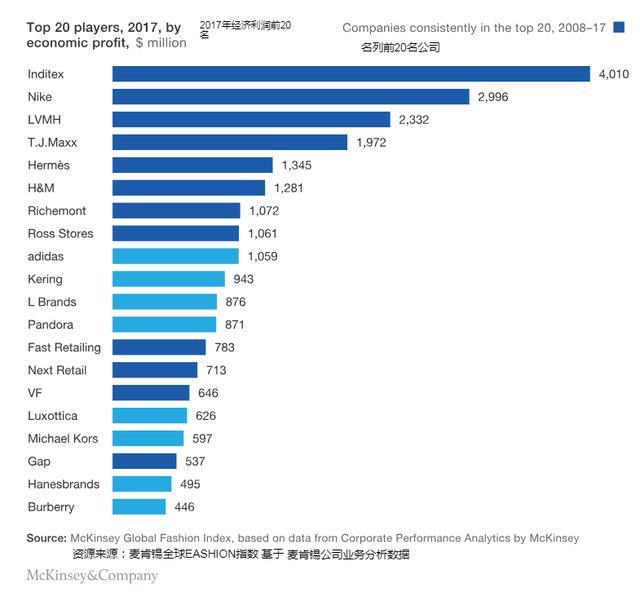 在时尚界,两极分化仍然是一个严峻的现实:整个行业97%的经济利润都是由20家公司赚取的,其中大多数属于奢侈品行业。值得注意的是,排名前20位的公司一直保持稳定。