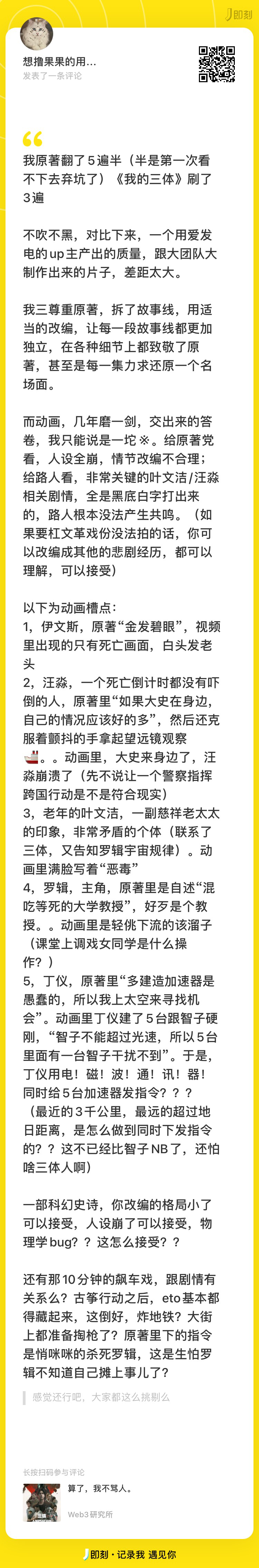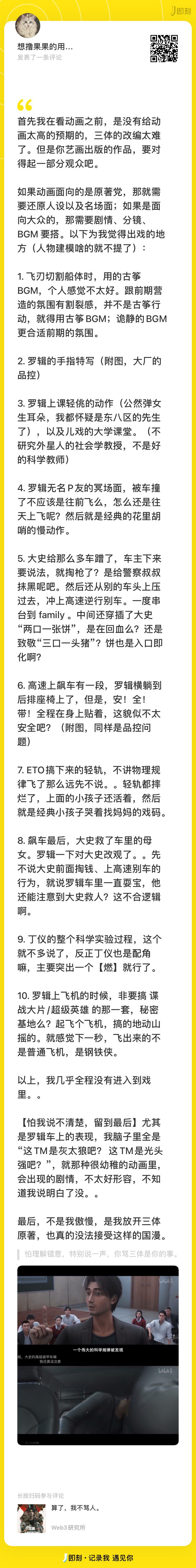 看别的电影也遇到过,字幕打了一堆东西,根本不知所云。。 代表不了路人,只是想表达:前面舍弃了好多铺垫,导致古筝行动该有的震撼力不足。 当前动画为了表现行动的紧张刺激,是牺牲了汪淼的人设,用汪淼的行为代入的。只能说,用飙车的戏份,投给古筝计划,应该能做的更好(最起码三体人,ETO,叶文洁,大史,汪淼 能先有个立体点的人设在。好过黑底白字的展现。。而且,好多人都不知道“注”能点开,信息就又丢失了好多) 汪淼在原著也基本是最后一次出现了,毕竟黑暗森林主角是罗辑,汪淼牺牲就牺牲吧。 但是🙃🙃罗辑人设也崩了。。。 //