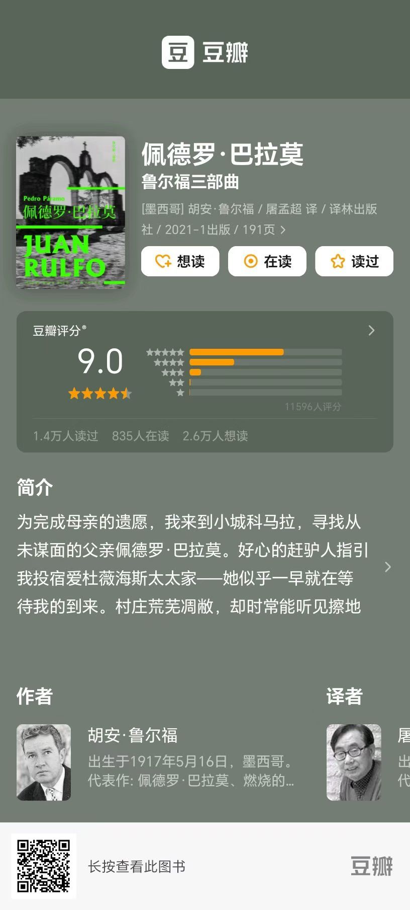 南美的作家既疯狂又令人钦佩。为了一个好的角色名称,就去公墓里的碑文上寻找,父母给孩子取下的真实名字毕竟比编写更能感受到用心;即将写下《百年孤独》的马尔克斯的悟道时刻发生在墨西哥出租屋中一张也做全家餐桌使用的书桌上;关于南美,马尔克斯有很多想说,但碍于种种的合理性不甘愿写成流水账但又不知从何下笔,就像大部分作者一样,直到他读到了朋友带来墨西哥作家鲁尔福的《佩德罗·巴拉莫》。原来,只要写得足够好看,不那么合理也是可以的。