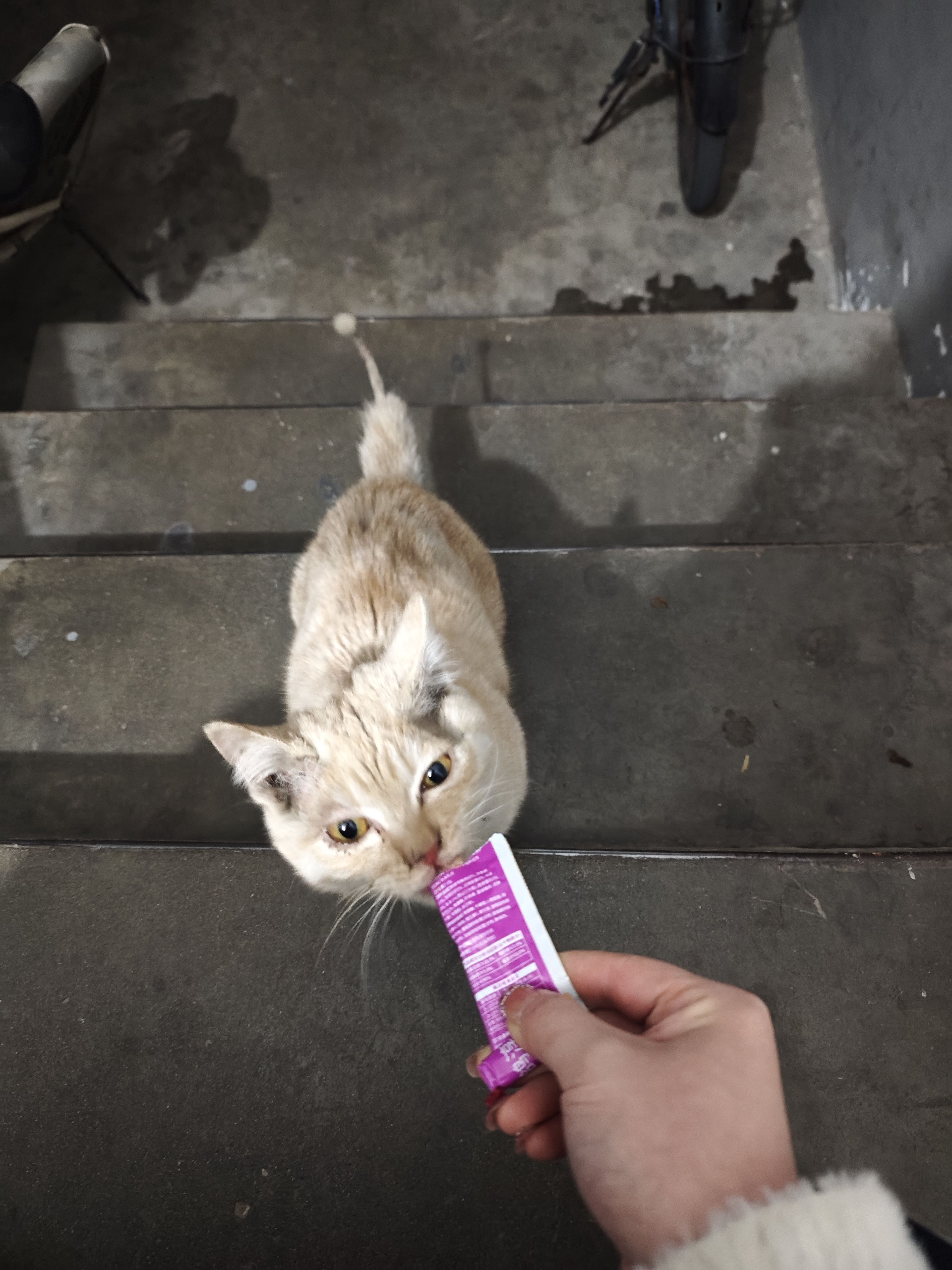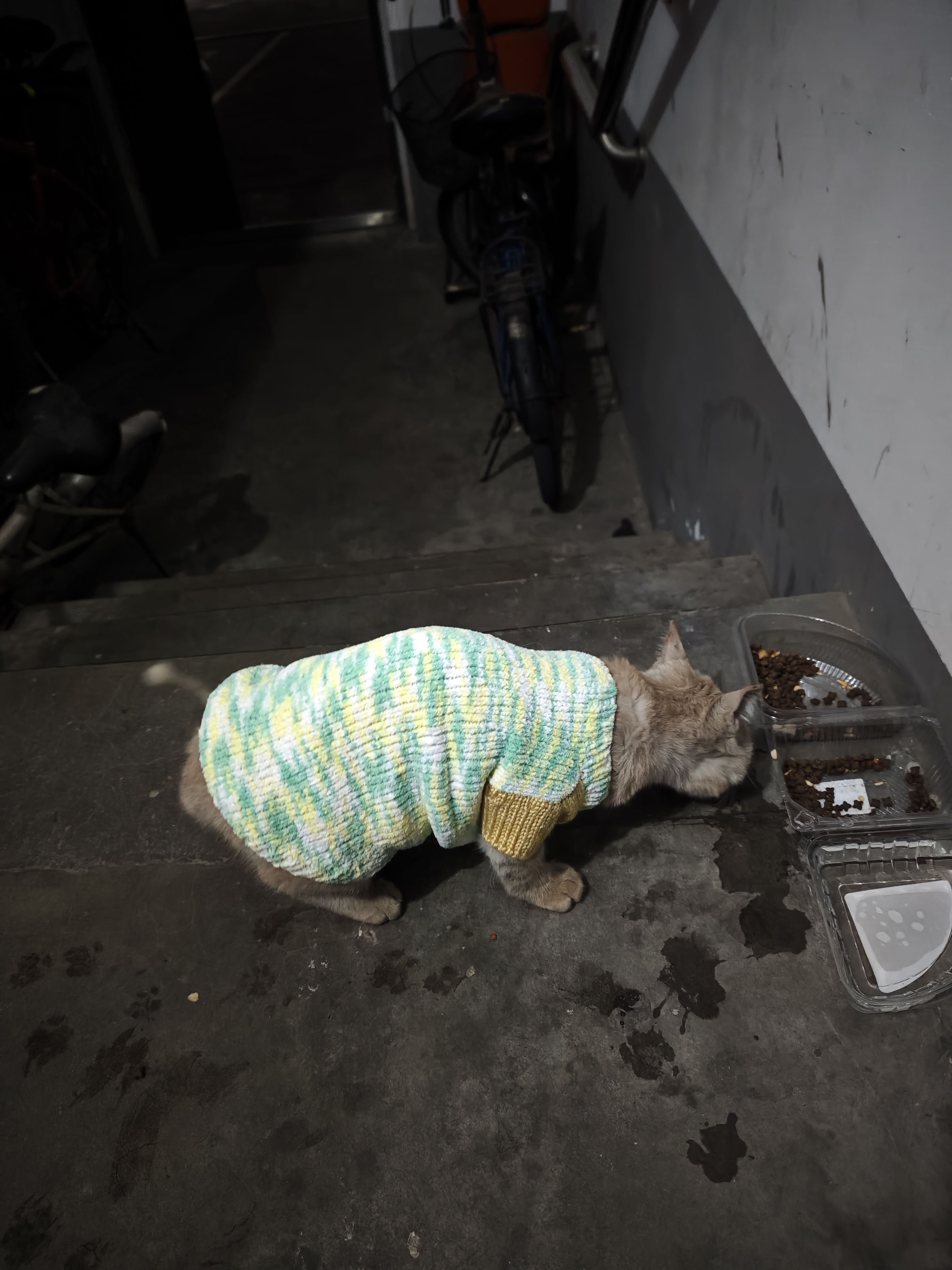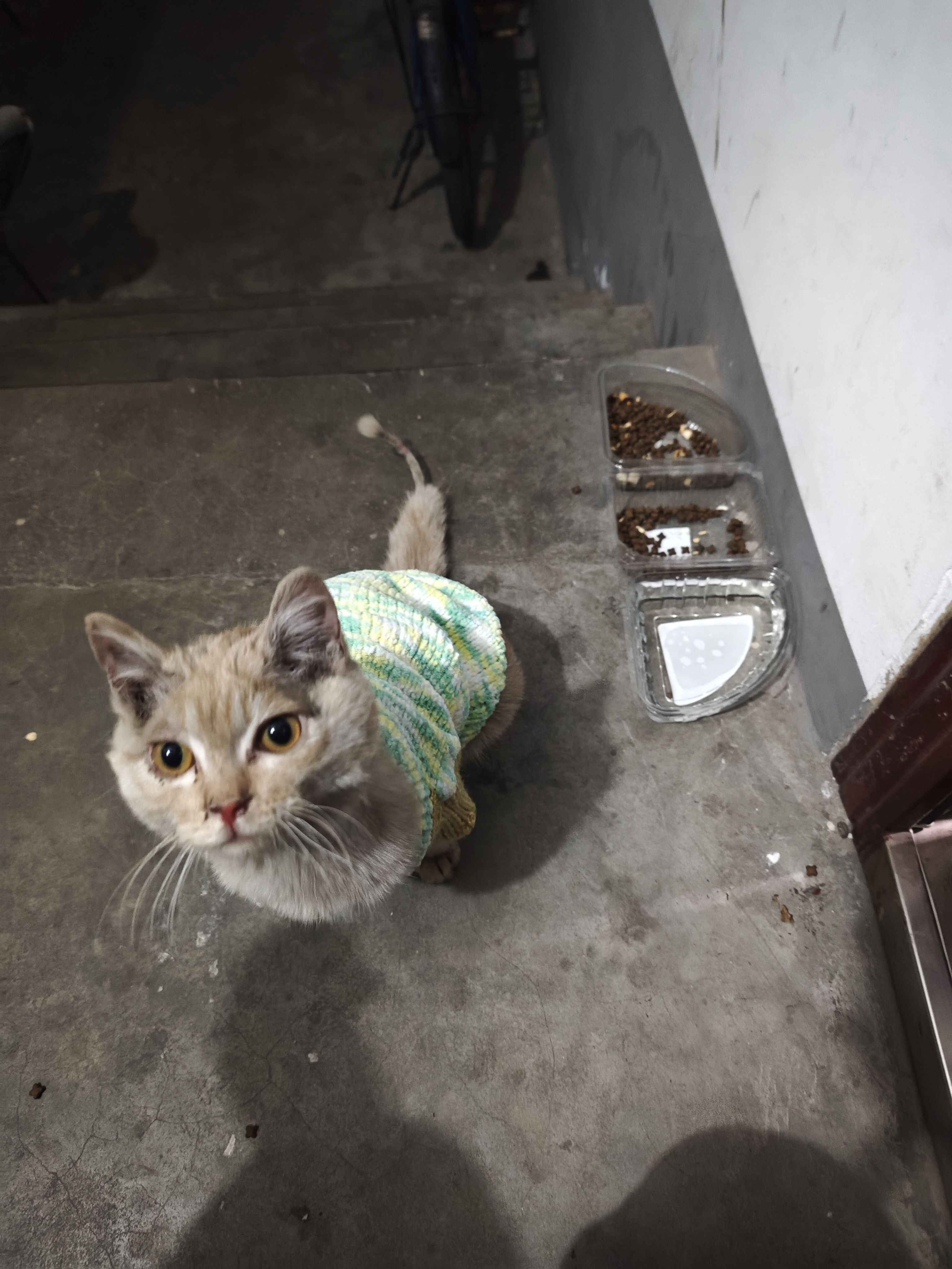他真的是一只很聪明的小咪,我一叫他,他就会跟着我,真的把我当妈妈了。我就这么带着他从电动车棚回到了家门口的投喂点。