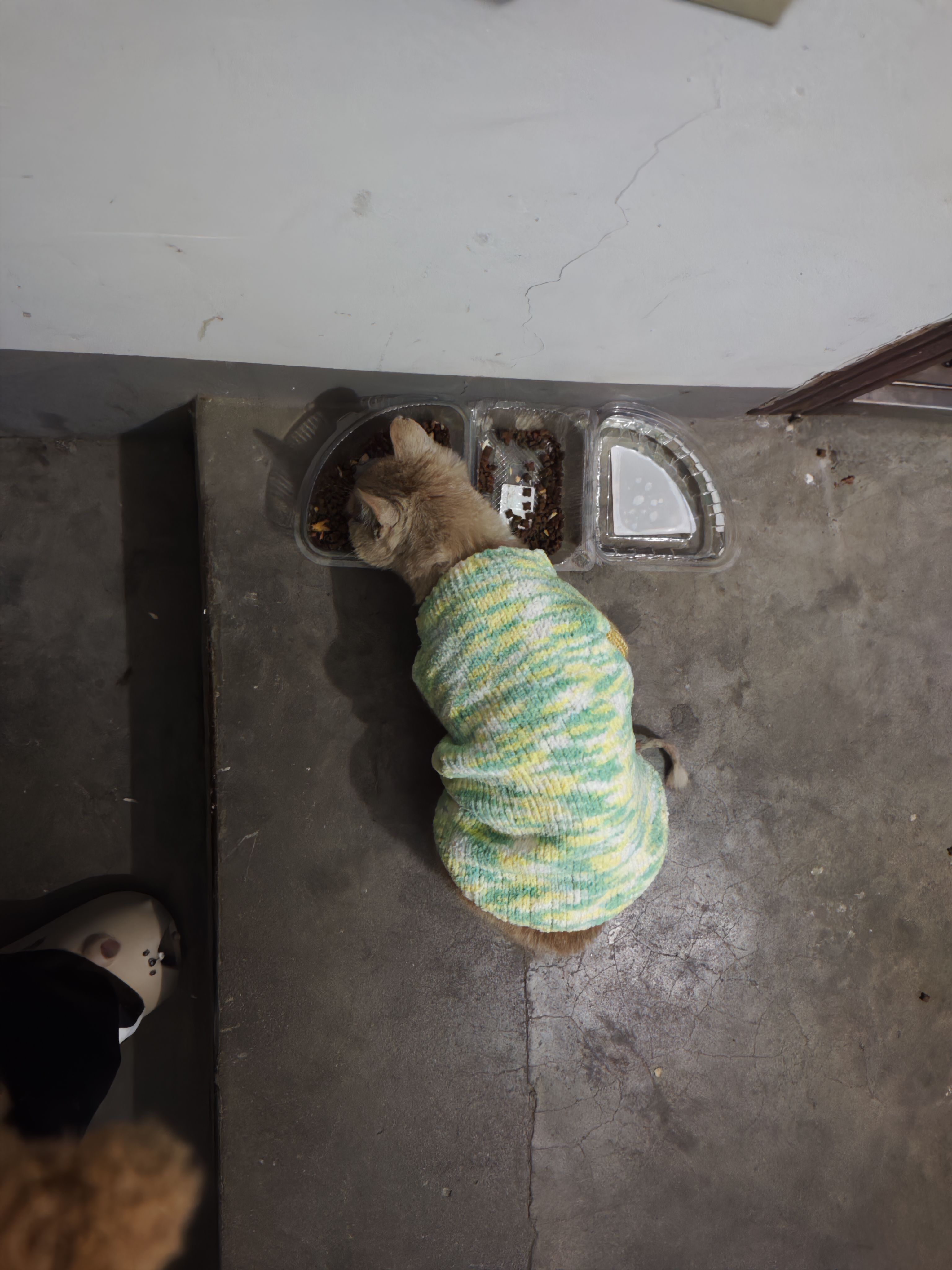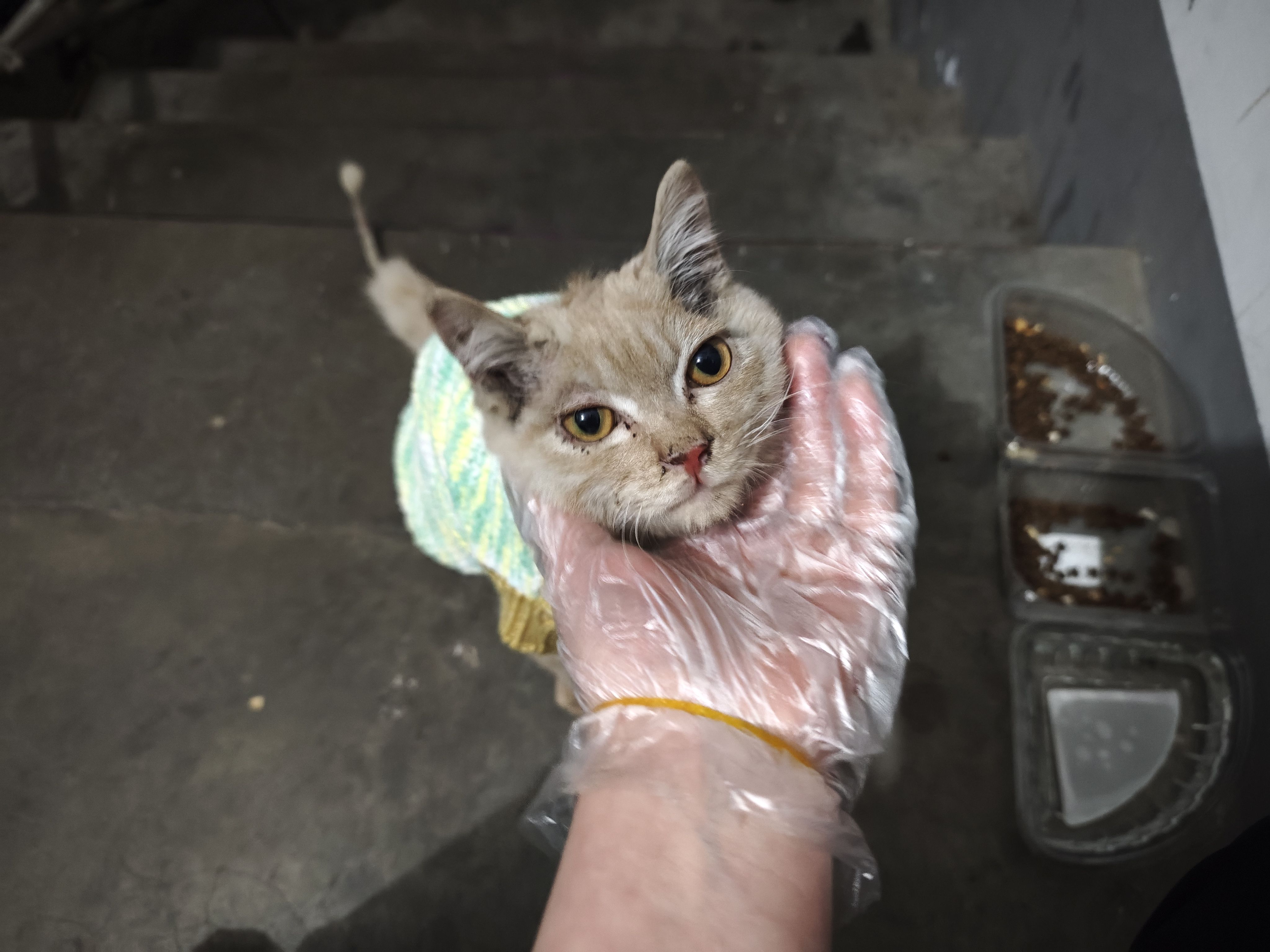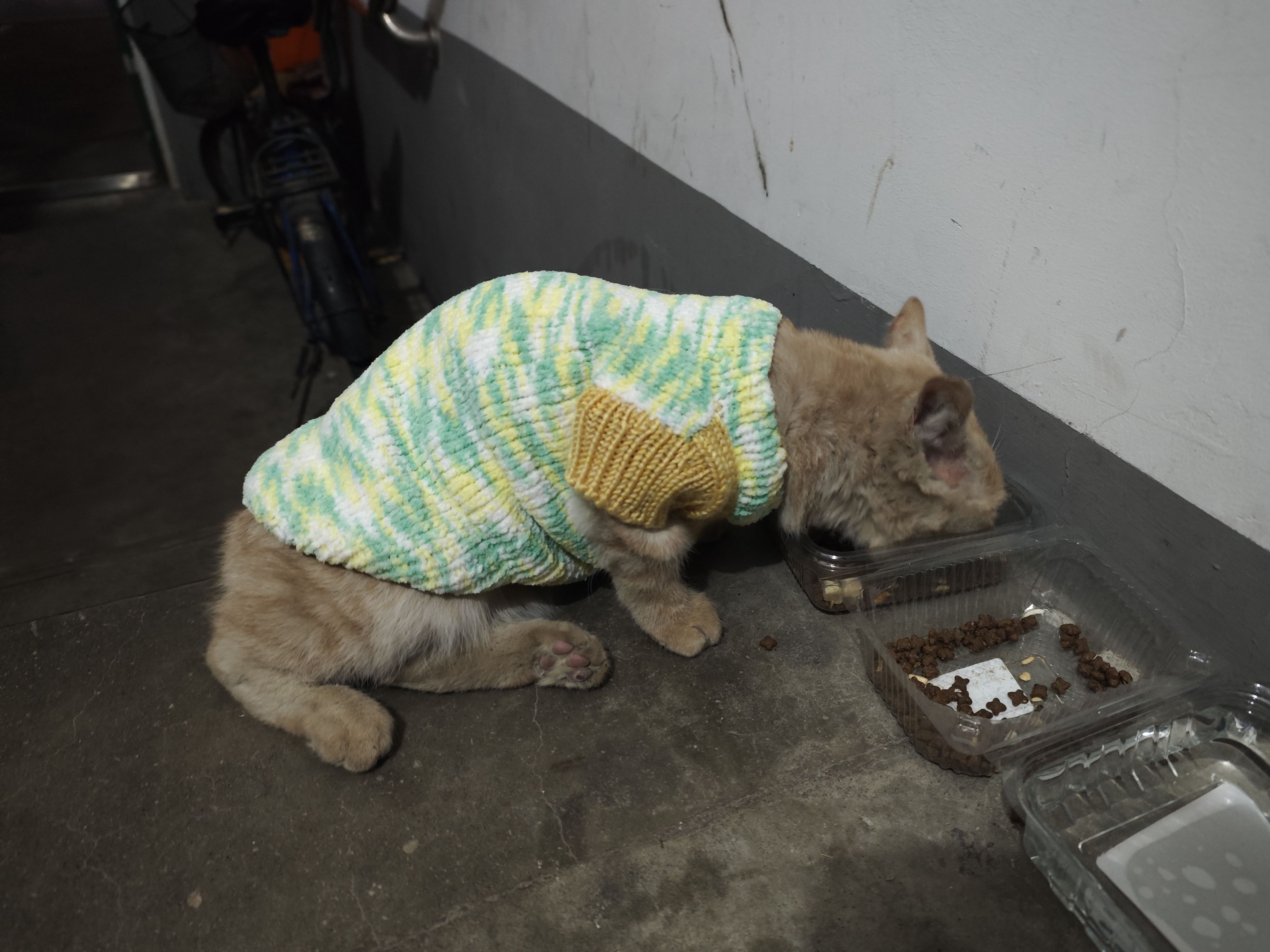 他真的是一只很聪明的小咪,我一叫他,他就会跟着我,真的把我当妈妈了。我就这么带着他从电动车棚回到了家门口的投喂点。