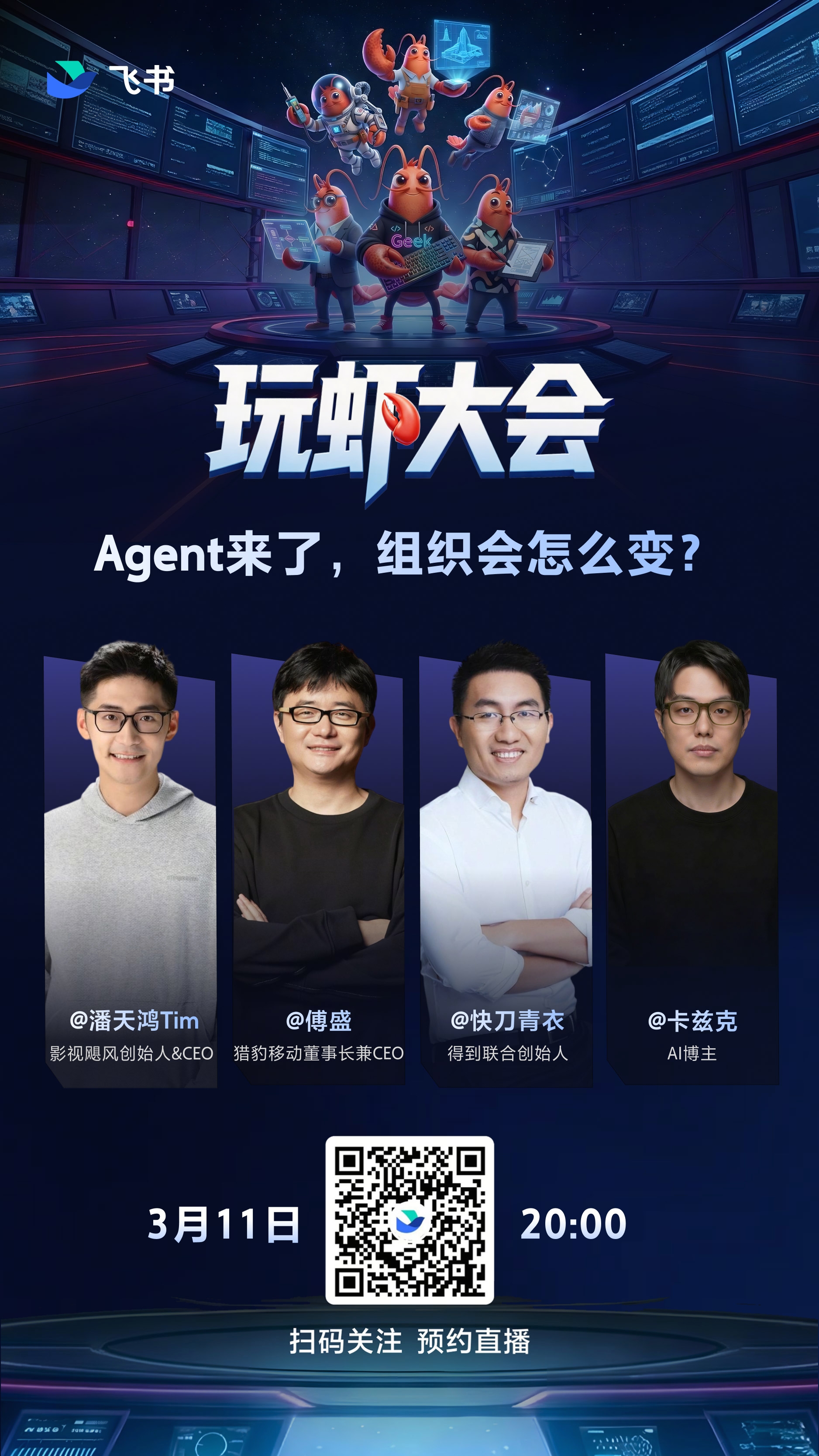 今晚20:00,影视飓风Tim、傅盛、快刀青衣、卡兹克做客官方直播间。