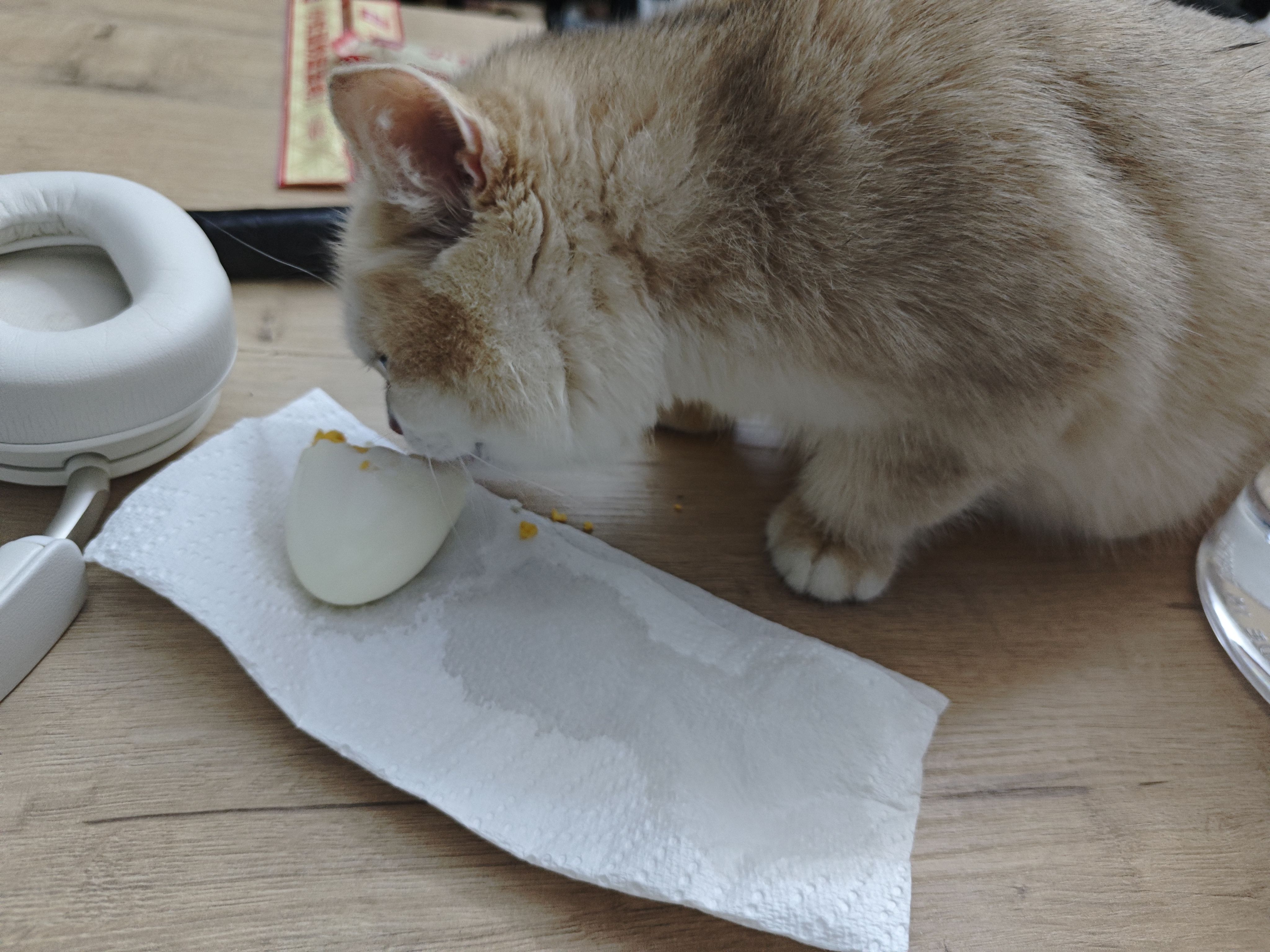 女朋友给我煮了两个鸡蛋,我在沙发上玩了会手机,小猫咪就偷吃了一个😭