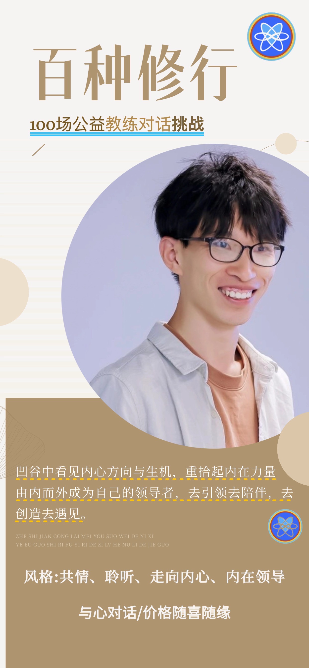 开始把正念冥想和教练结合正式向外提供教练服务,并教练对话重心转向激发个人内在领导力进行公益教练,招募个案支持帮助有需要的人,发起(100种修行)挑战招募100位案主,帮助支持有想要在生活中发展出更多可能性的青年人、创业者。在职业、生活、情绪、生命卡点中,看见自身生命的潜能与可能性,勇敢地生活,茁壮成长成想要的模样,而不仅仅是认为跟随社会时钟或被允许过上的生活。同时发起教练幼芽生长项目支持教练伙伴互相成长。