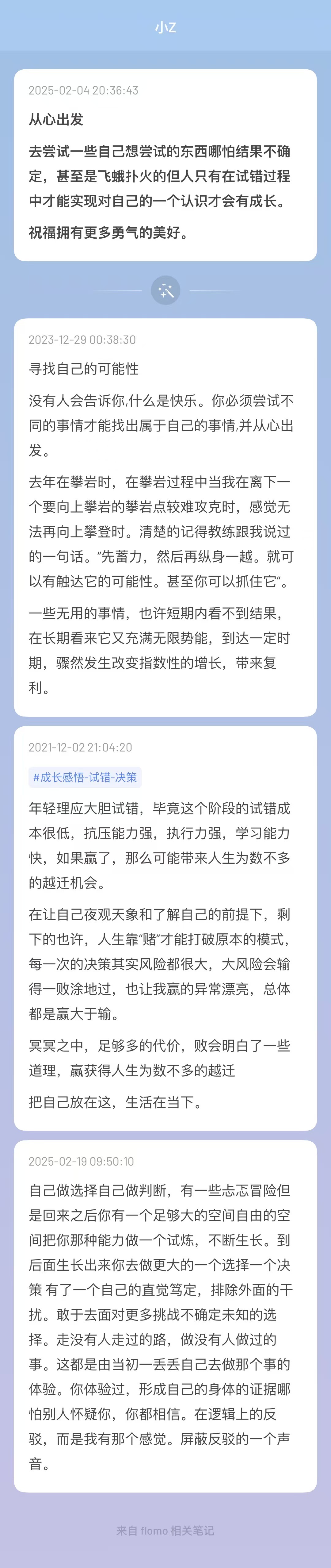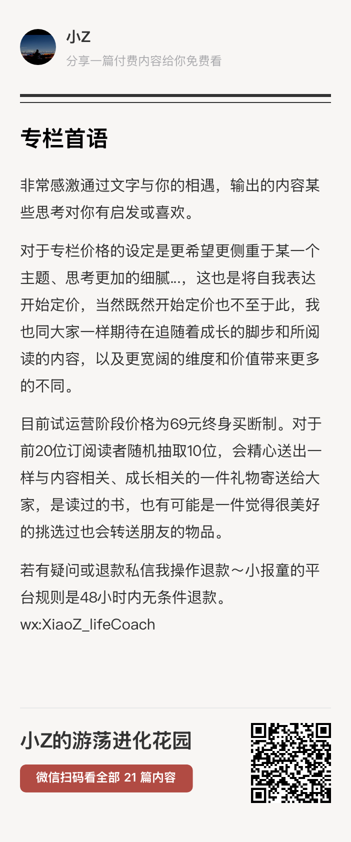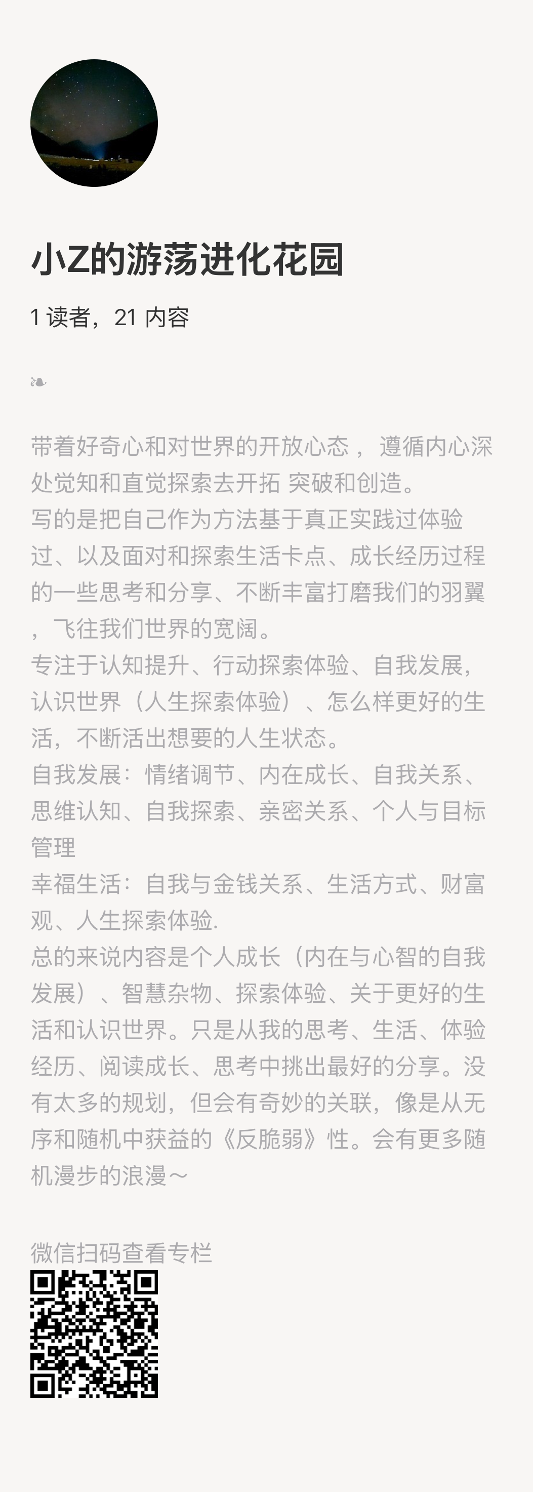 创作者身份开启,上帝为你关上了一扇门一定会为你打开一扇窗,五年之前一直都是infj内向的某大厂技术工程师,2020一个低谷找回了遗落角落的好奇心,打开了开始对生命及自身的好奇热切探索的那扇窗,因此热爱上了阅读,开通个人公众号,开始公众表达,和日更朋友圈。随而开通了自媒体小红书和播客虎嗅平台开始专注于个人成长、自我发展、内在发展、教育、探索世界与人相关的内容创作,,发展出一个工作之外的斜杠创作者身份。阅读、日记、写作精神食粮。