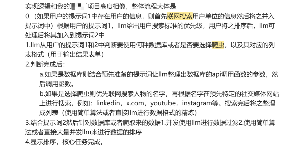 不久前看了于北川哥的lessie.ai(功能即一句话找到你希望找到的人),本来打算复刻一个的,结果发现lessie.ai和我俩月前开发的信息搜集ai(自用)的技术栈90%+重合了,模块高度相似,直接就不用做了。本质上就是通过api(或者联网搜索),简单算法,llm处理,使得用户可以直接得到想要的信息,简单讲,即相当于是一个管家进行打开网页点击网页等浏览器操作后将数据处理几遍后再打印出来直接给你看,图二是我总结的lessie.ai实现流程。