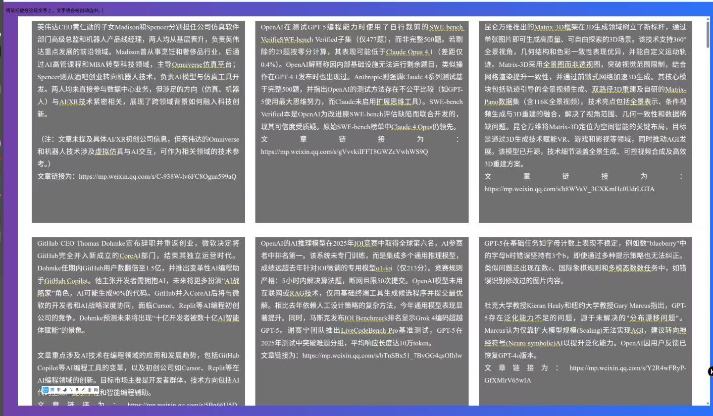 原理:通过同时百次调用llm。ai把视频内容转成文本并入文字新闻,然后直接提取你希望得到的想要看到的内容,并自动分析其中的复杂词汇,然后作出解释(可联网搜索)。因此同一个网页就可以看到所有文章中你想看到的内容以及通过鼠标悬浮在复杂词汇上就会自动看到解释。