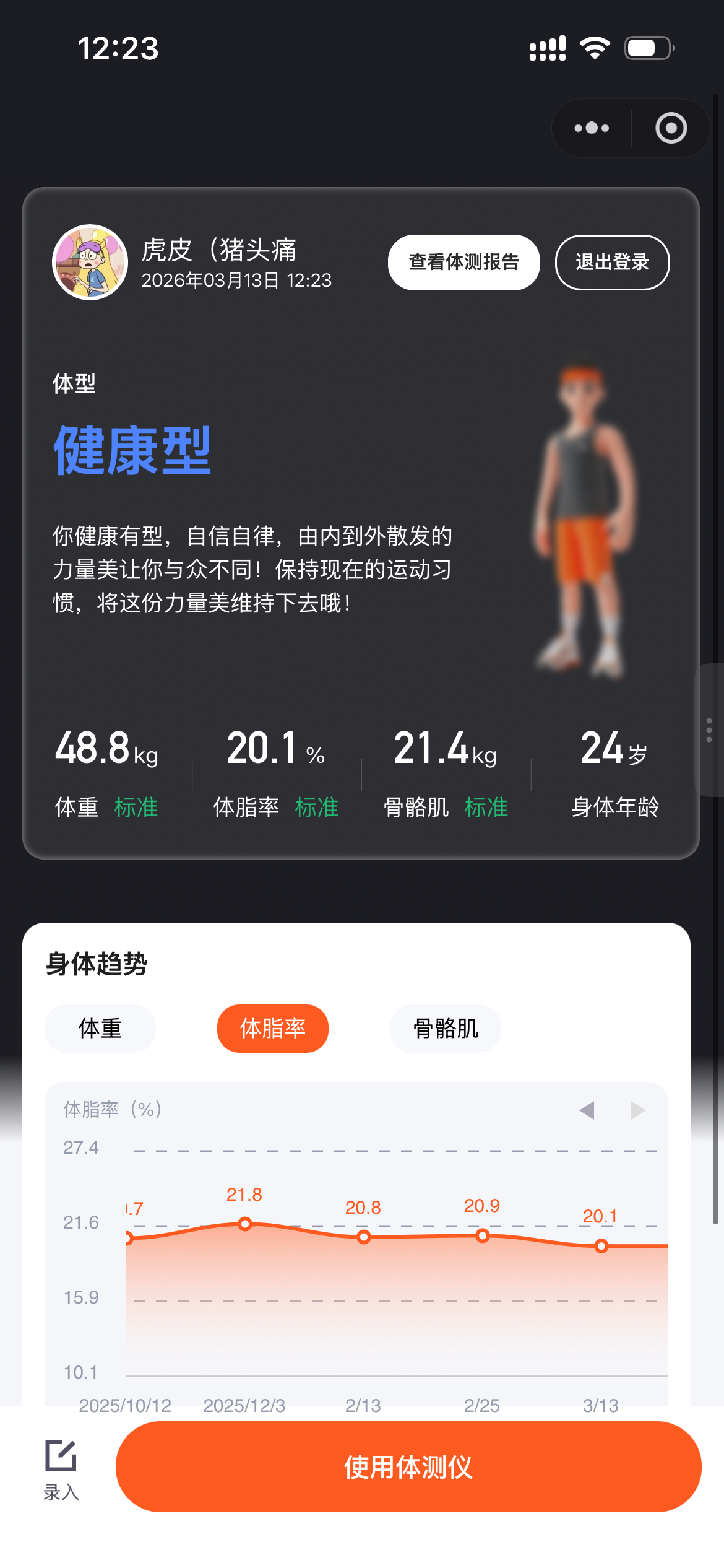 测了体脂 体脂 下来了比开年回来 称的 降了百分之零点八 好事