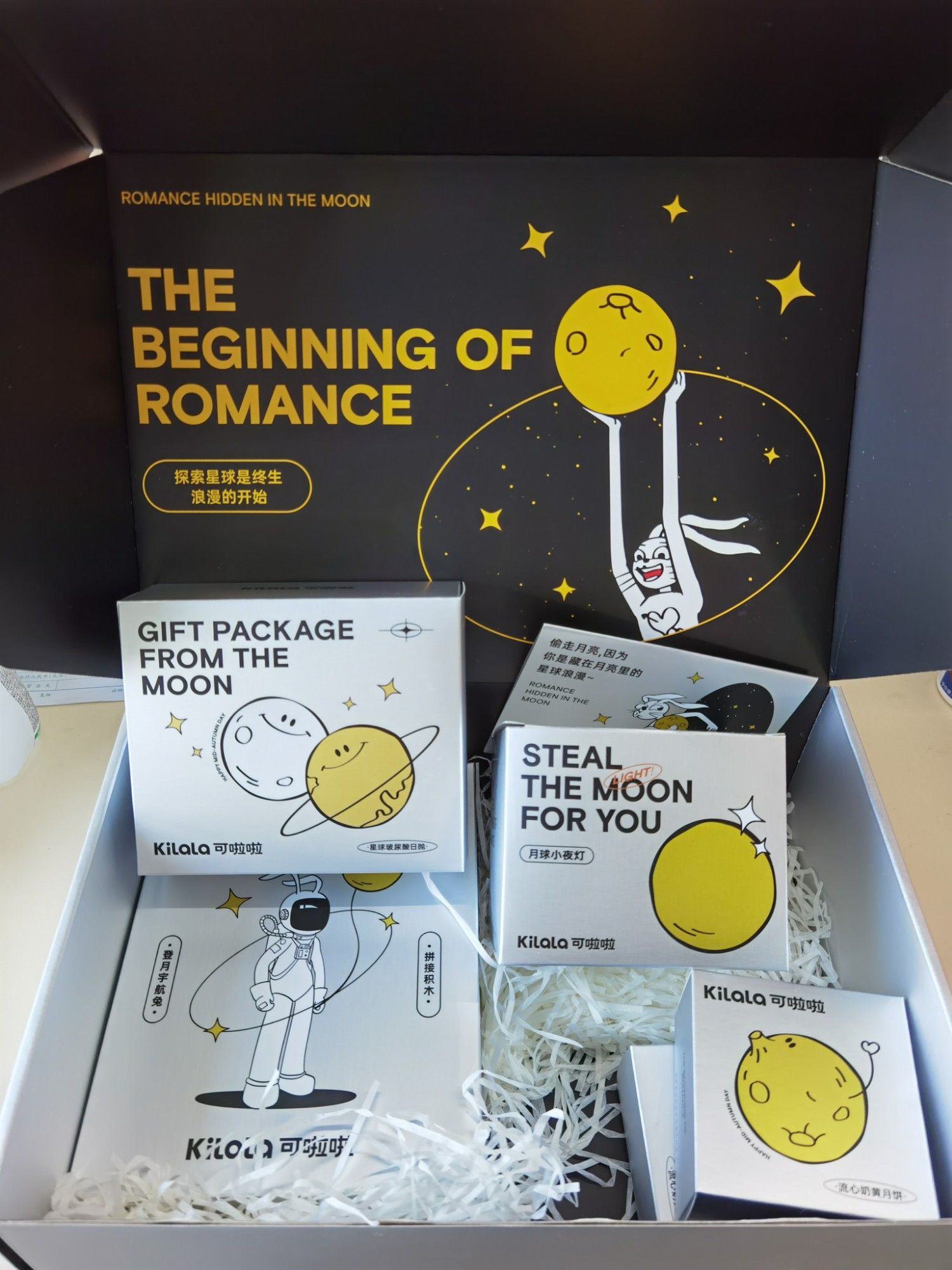 从礼盒的风格设计,产品以及积木宇航员,月球夜灯,月饼都体现中秋 登月,探索星球的产品概念。