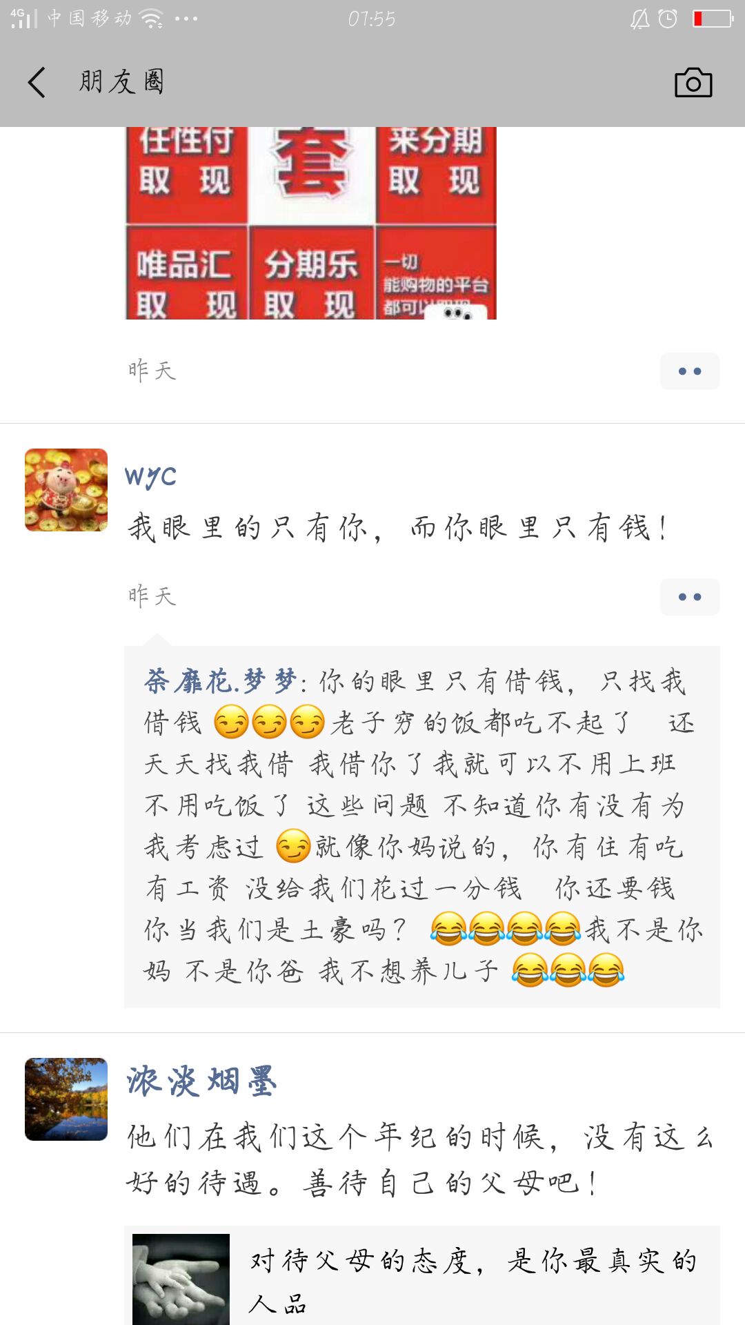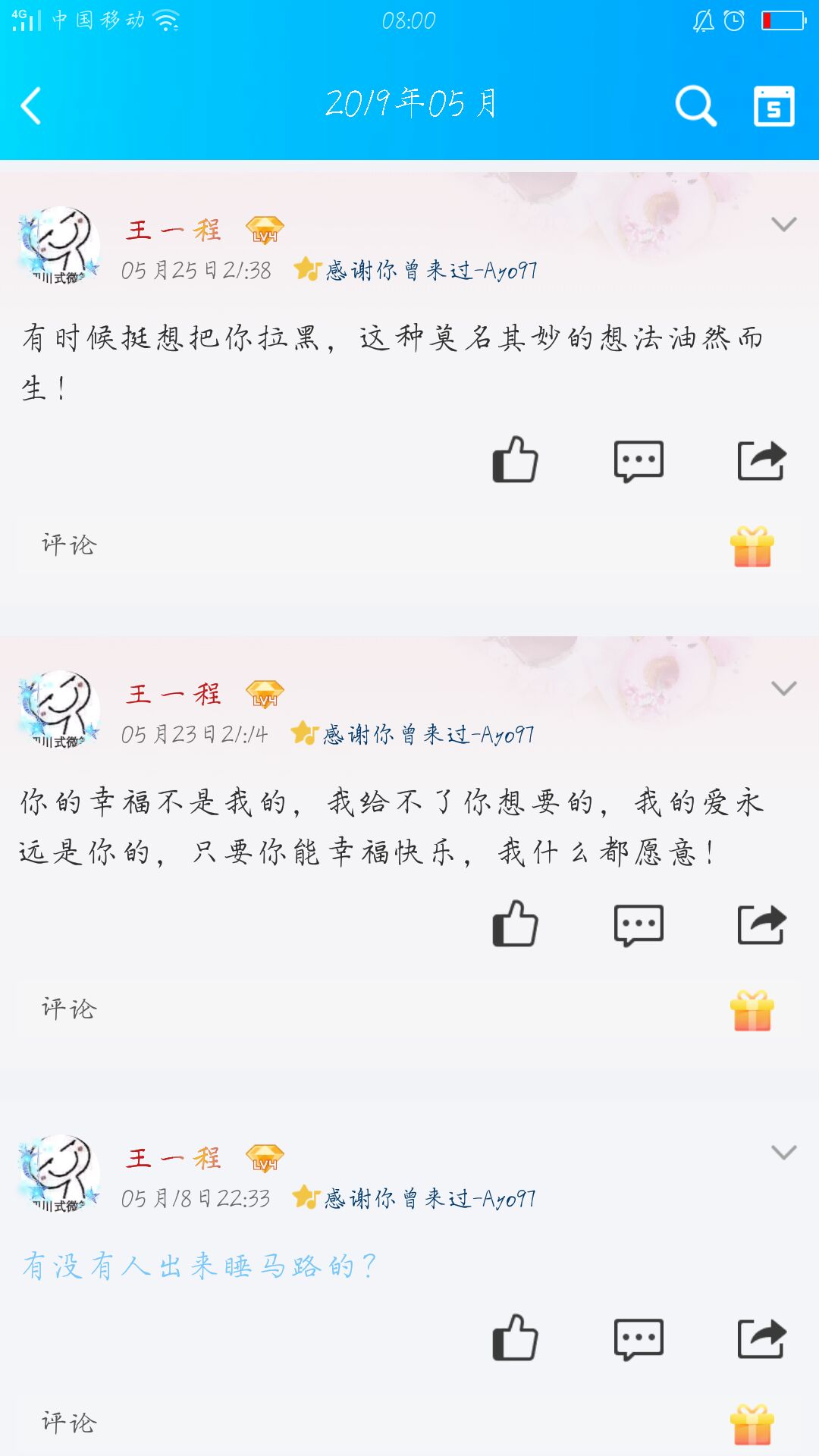 给爷爷奶奶打电话,说了最近的计划。准备考完试就去找工作的我,层层遇到尴尬。在钱的问题上,爷爷总是先看到的是钱,问我为什么不去实习,非要去考试?我不知道怎么说 😂😂😂电话没打完,我哽咽了,眼泪止不住的流了下来。室友去了成都,有住的地方,和男朋友一起,还找到了工作,好让我羡慕。而我呢,没工作呢,正在找,现在找工作确实很难,连住宿都搞不定,又没有男朋友,有,还是异地,不闻不问,感觉就像死了一样 😂😂😂被喂饱了两天的情人节,我想说,终于过去了。平时那么爱发说说的我们,在这两天里面没有一个人出来说句话。可能,这个实习期才是我们真正所见到的社会吧。临近毕业,也正是分手季。见过,初中毕业季,高中毕业季,到了大学,也落在了我的身上,大学毕业季分手季。好第一次见呢!以前的学长学姐们说的还不相信。现在的我,相信了,真的毕业了,也就再也不见了。我想经过这一次六个月的实习期,我们就真的长大了。不会像刚开始的哪样,傻傻的,很天真。毕业就结婚,好吗?好的!想想还真挺傻的。所谓的爱情,到了现实面前,都会被打败的吧!以后的要很有钱很有钱,以后的很努力很努力做好自己,以后的我要好好的爱自己,不会让自己再相信爱情了。💔💔💔