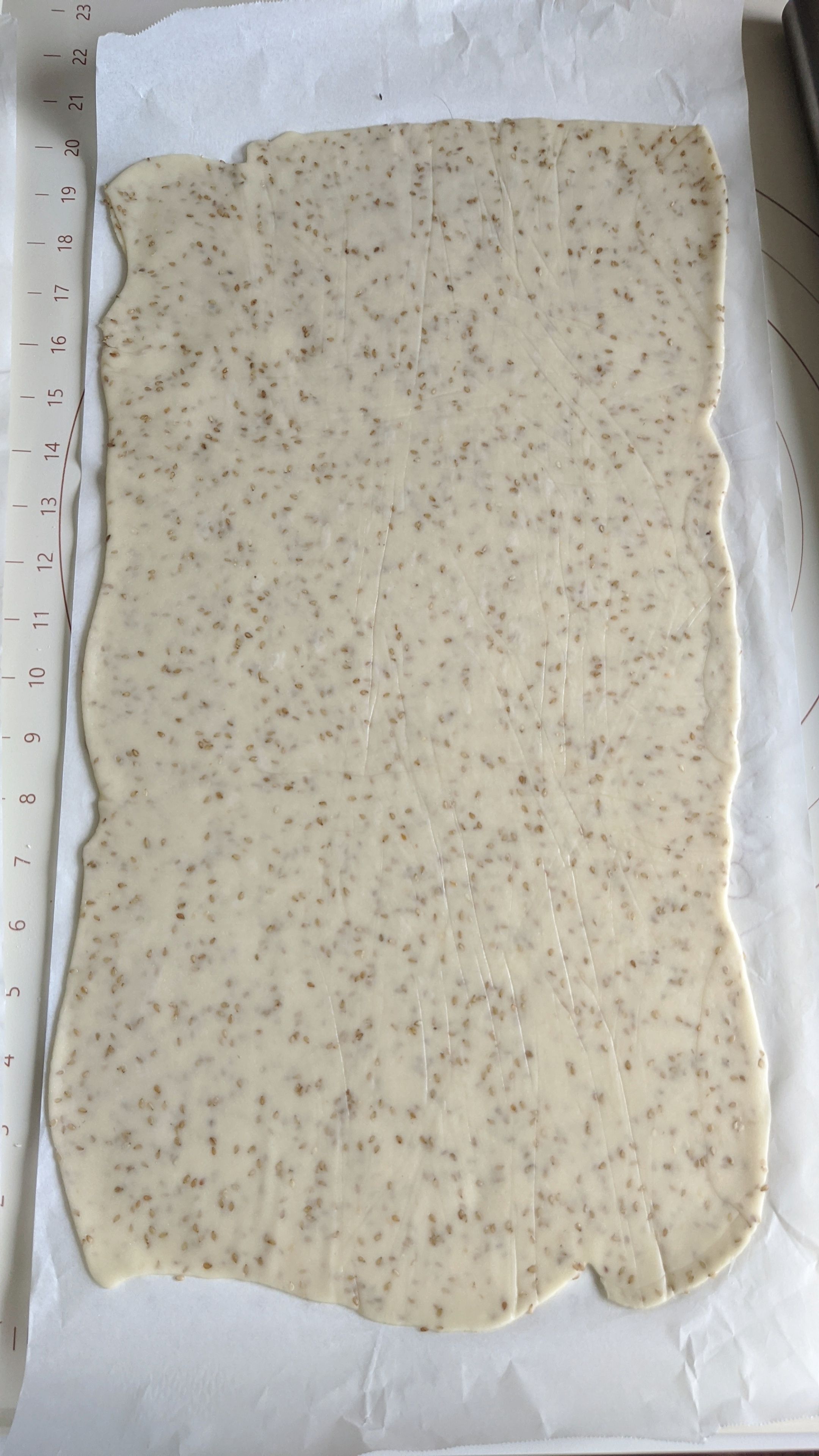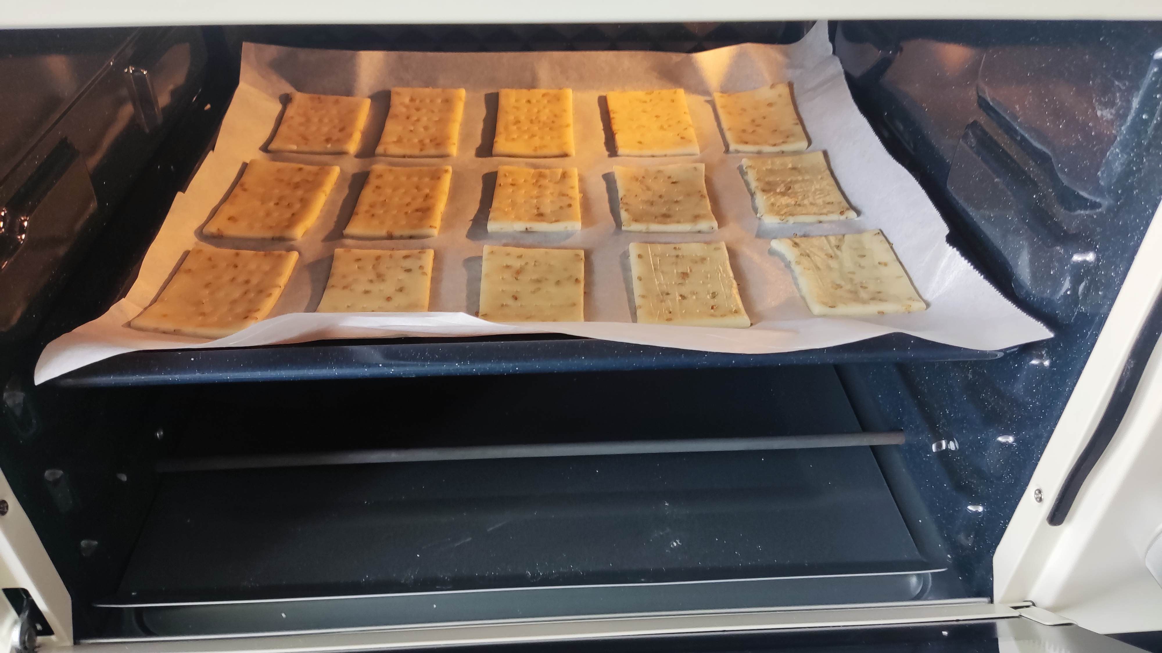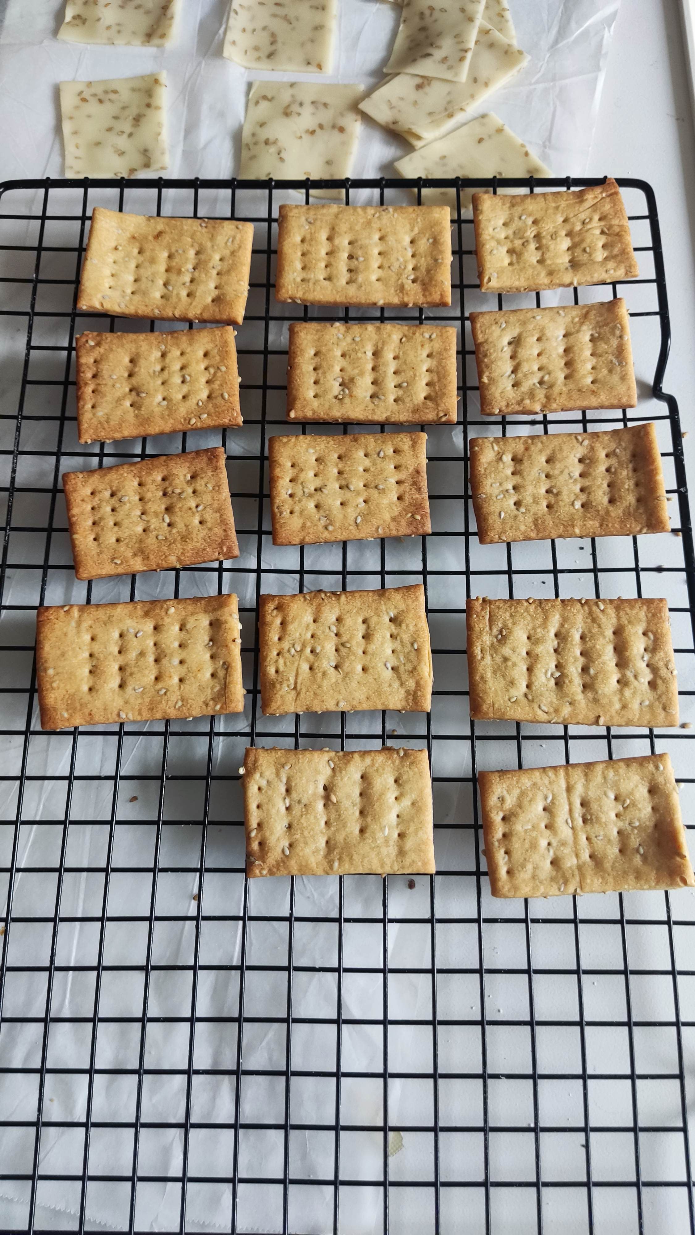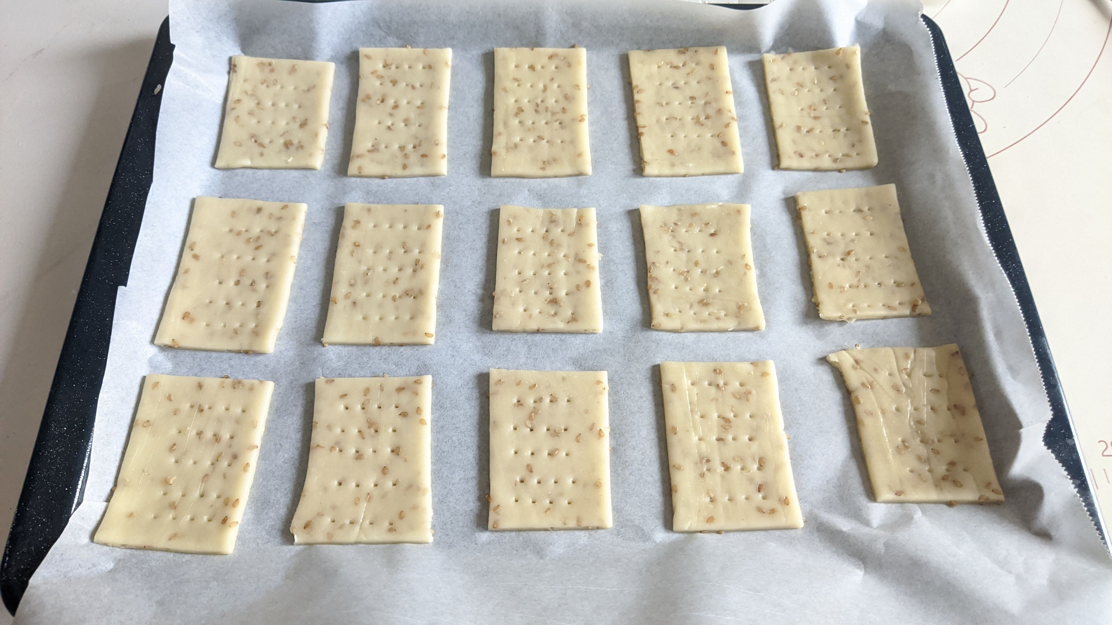 今天参照苏打饼干配方制作了一下,不需要怎么揉面,醒发一次,隔着硅油纸擀薄,切片扎孔,就可以放进烤箱进行烘烤。