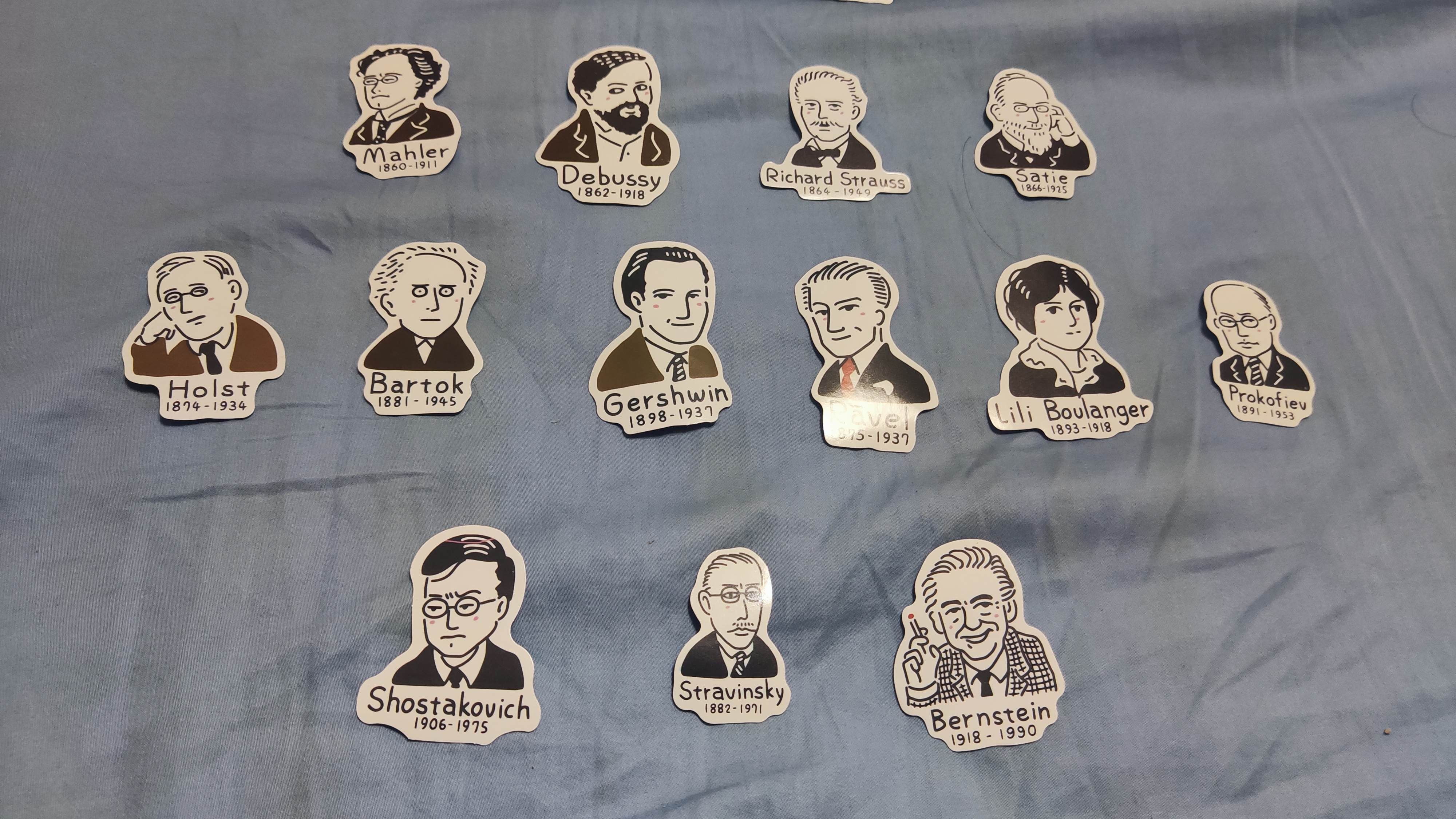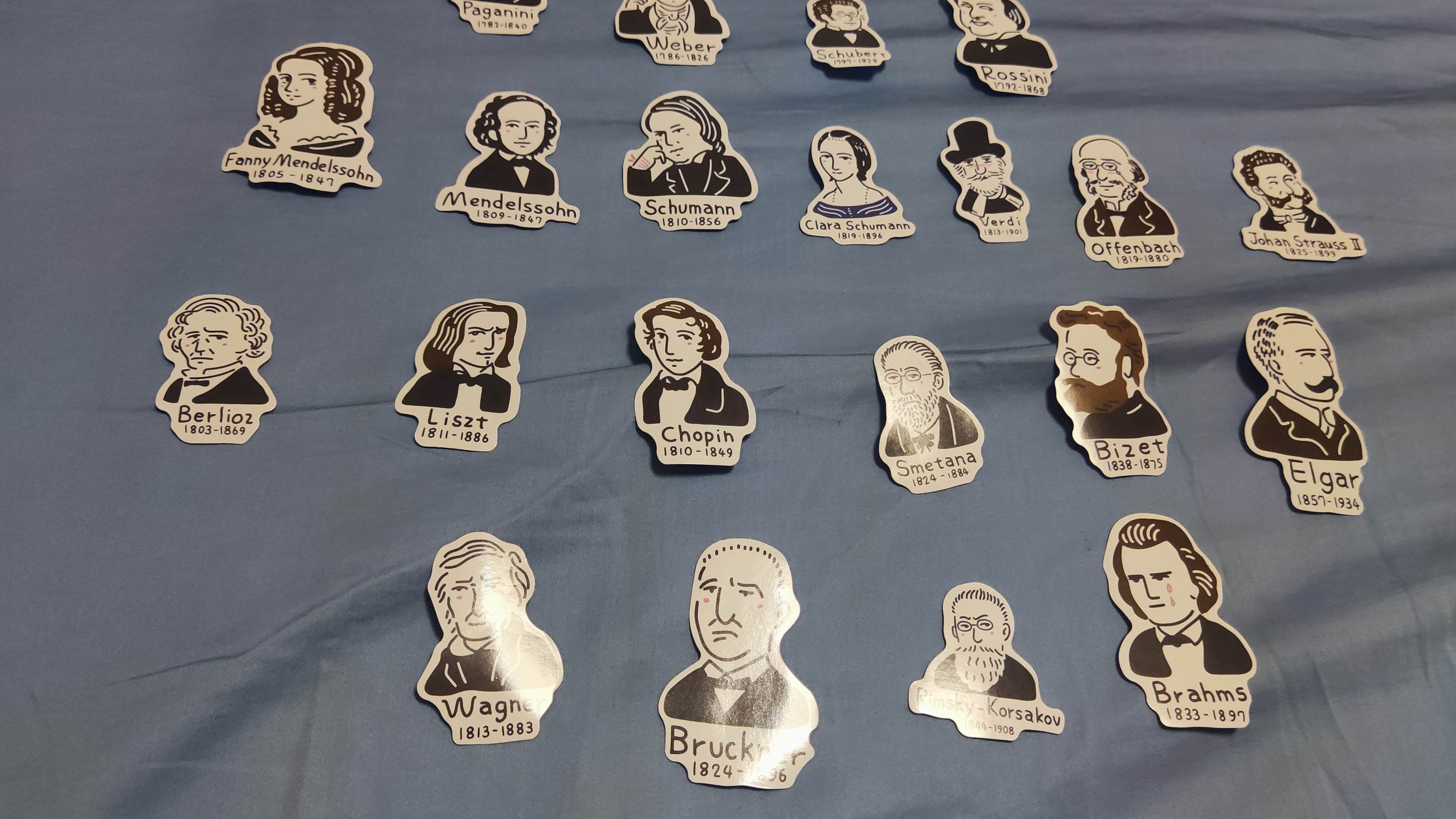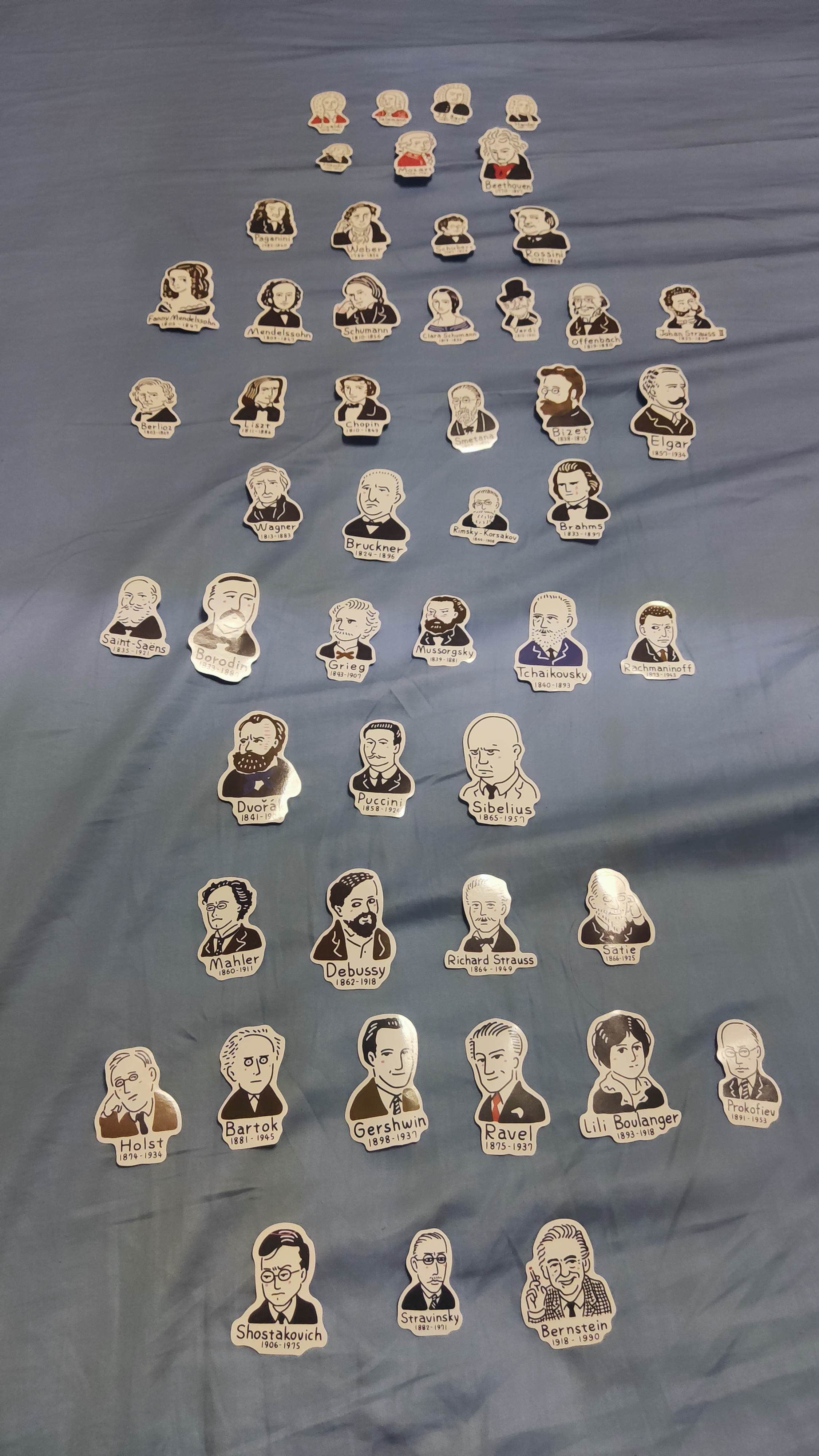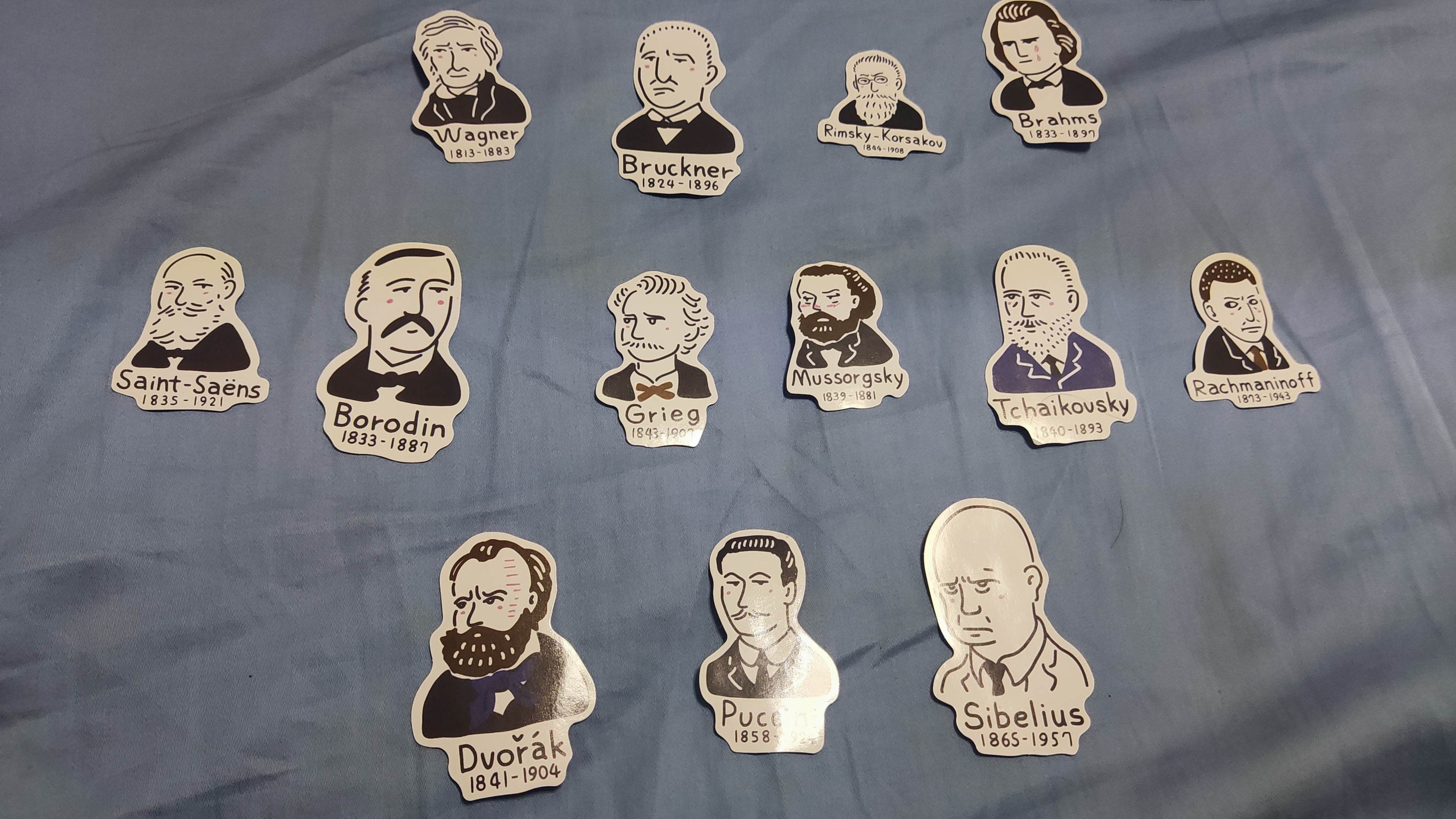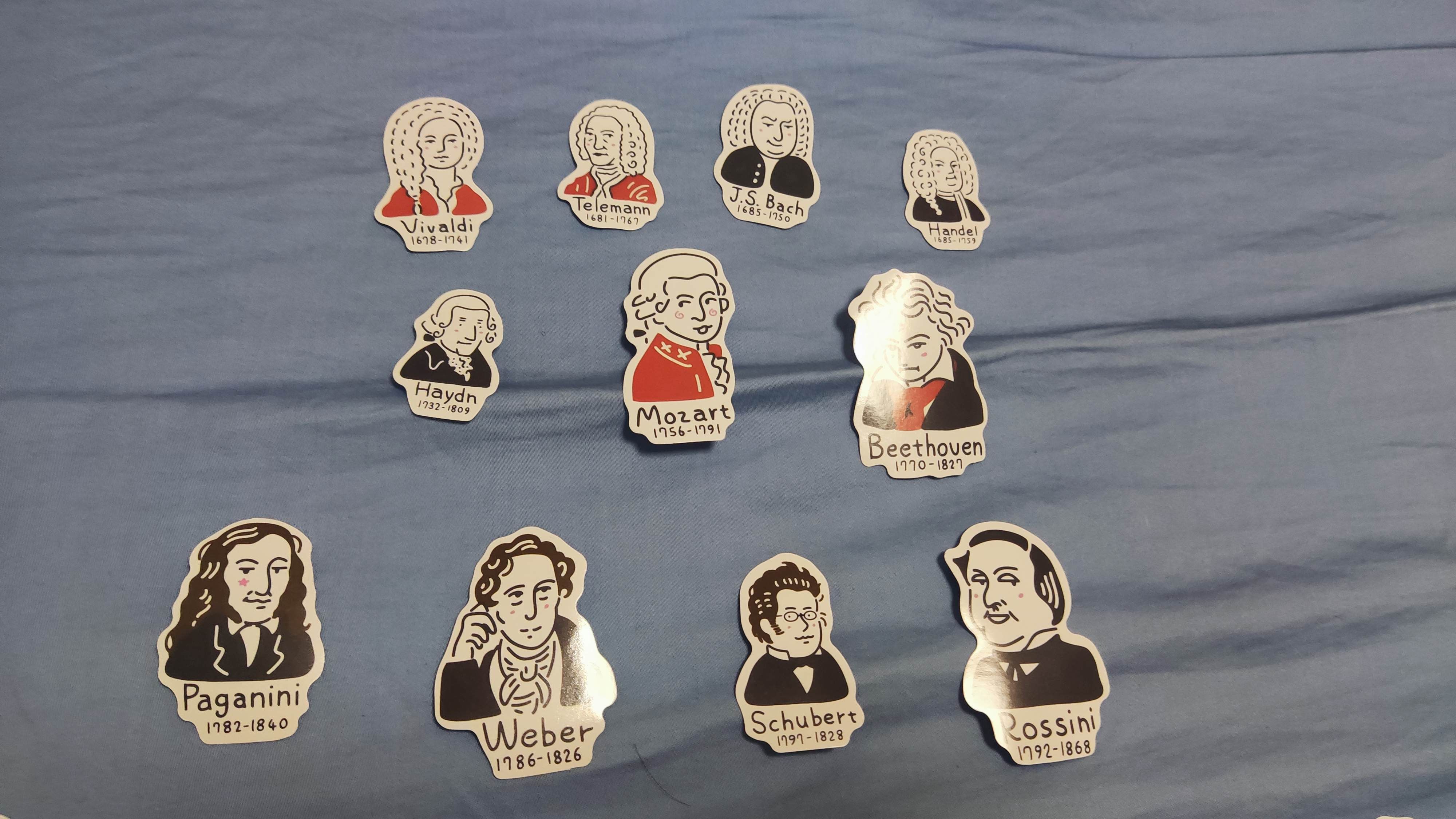 有意思的贴纸,古典音乐大师们的表情包,参考了图七到图九的音乐谱系图,大致按时间顺序排列了一下