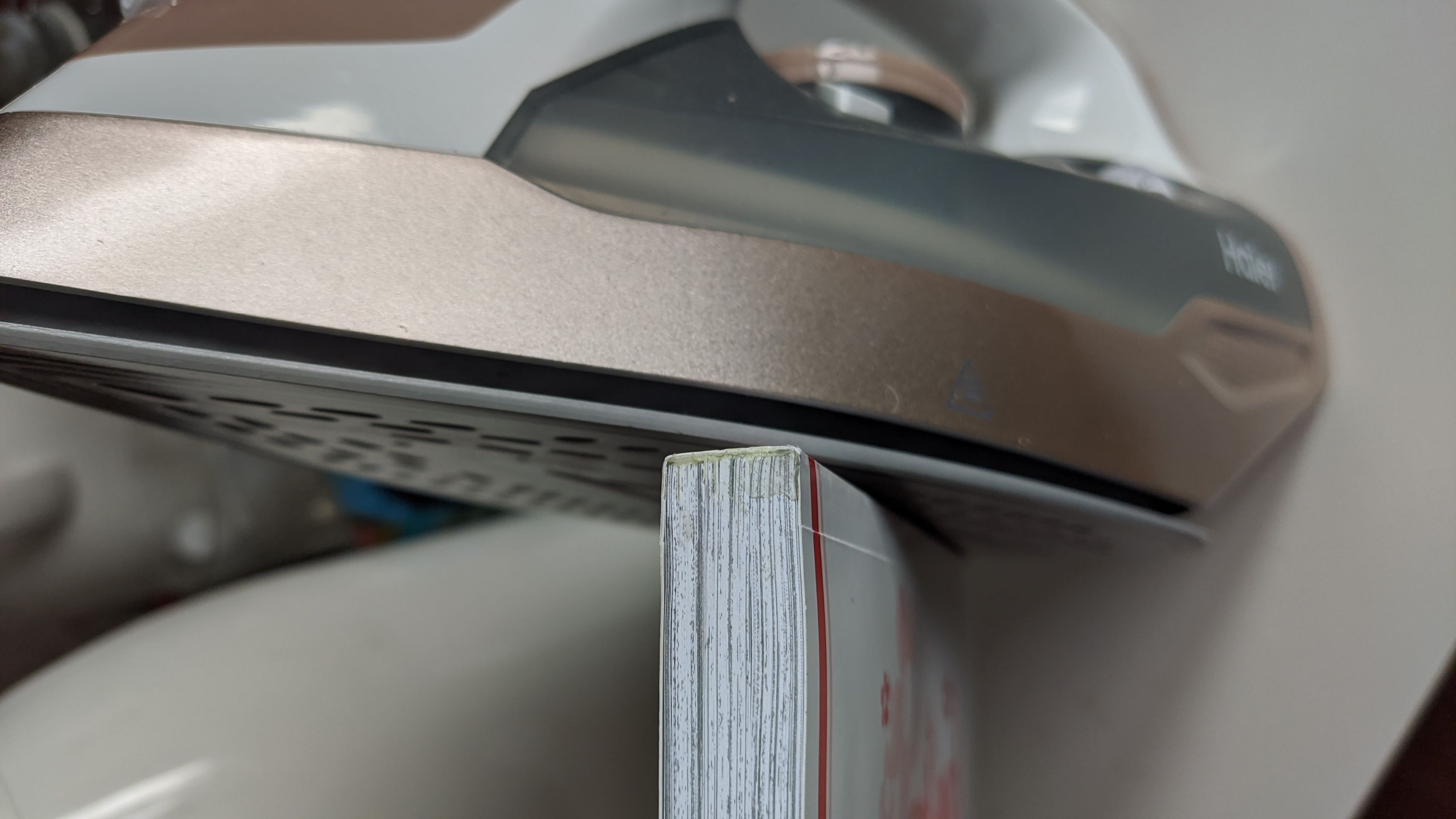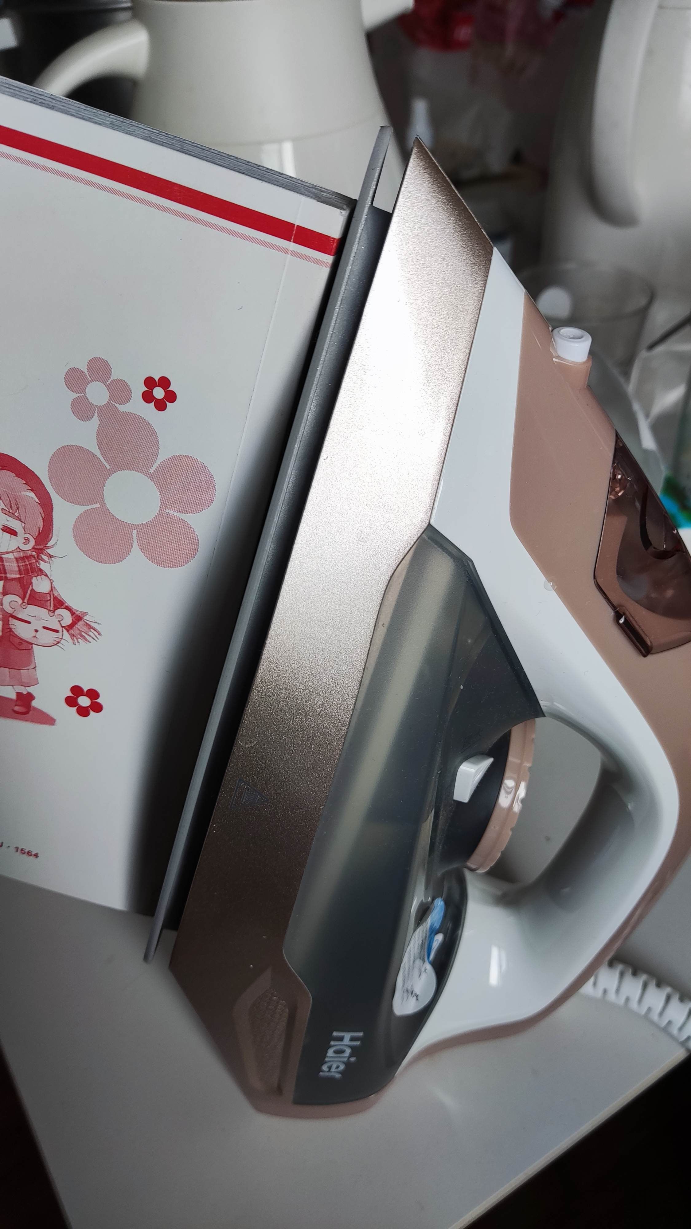 📚调成羊毛丝绸档位,慢慢加热融化书胶,避免封皮烫损,对齐夹紧图书,可以使用大号夹子固定,让断胶处完全融合,关闭电熨斗,让书胶彻底冷却凝固。