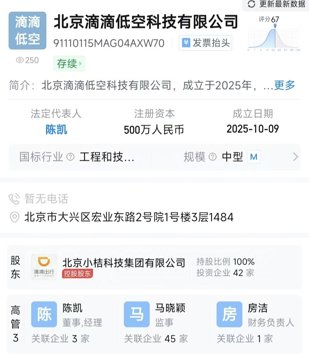 滴滴近日在北京全资成立“北京滴滴低空科技有限公司”,注册资本500万元,由母公司小桔科技全资持股,法定代表人陈凯,经营范围含人工智能软件开发、互联网销售等。此举标志着中国最大出行平台正式进军低空经济领域。