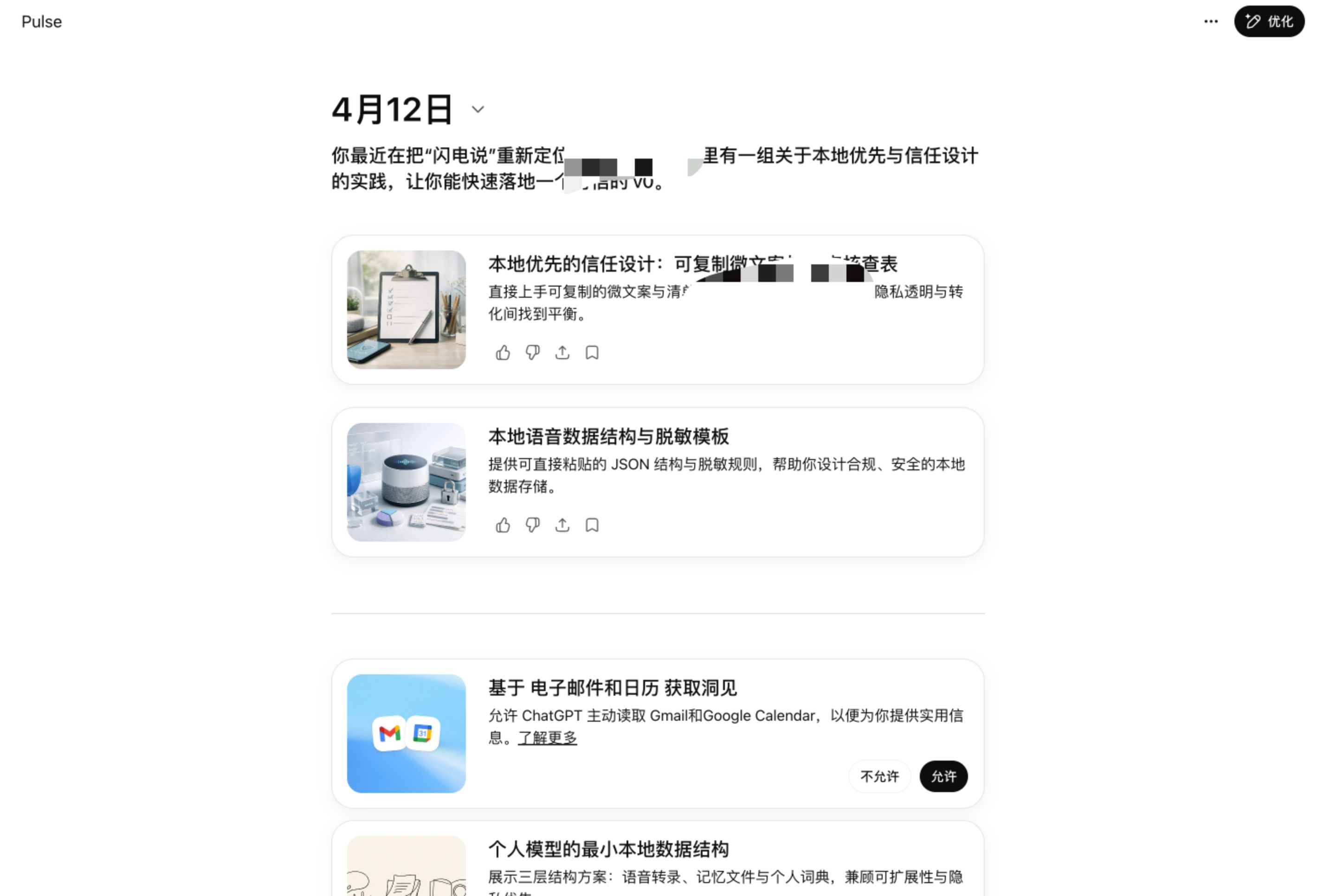 早上打开 ChatGPT 看到根据我正在关心的内容出现在眼前,我觉得 Pulse 就是未来获取个性化资讯(信息)的雏形,基于自己的喜好去获取信息,并且这个喜好是自己可以控制的,推荐系统很多工作会回归个人,推荐平台会受到巨大挑战,或者是说不会像以前那样被平台控制。